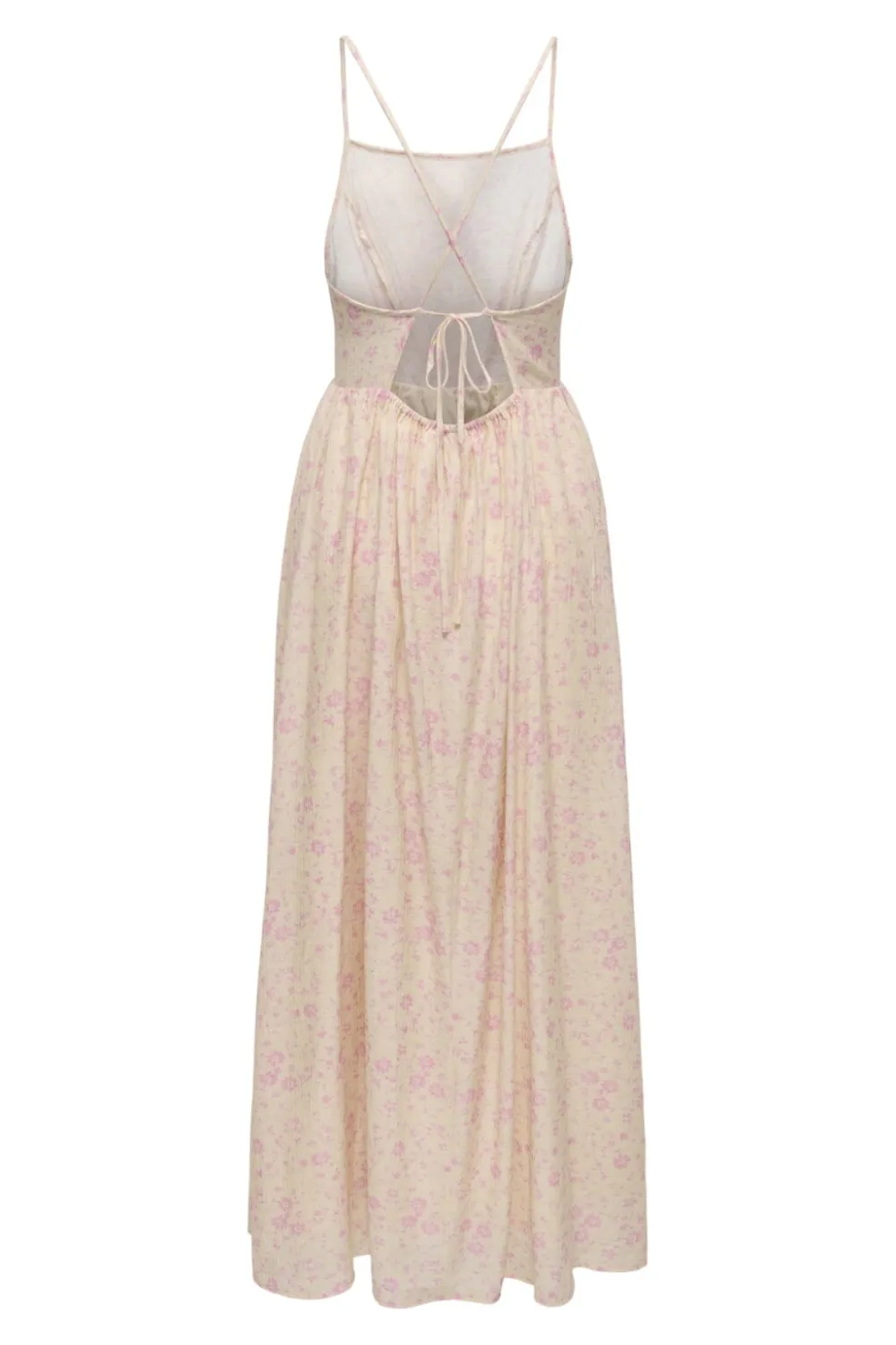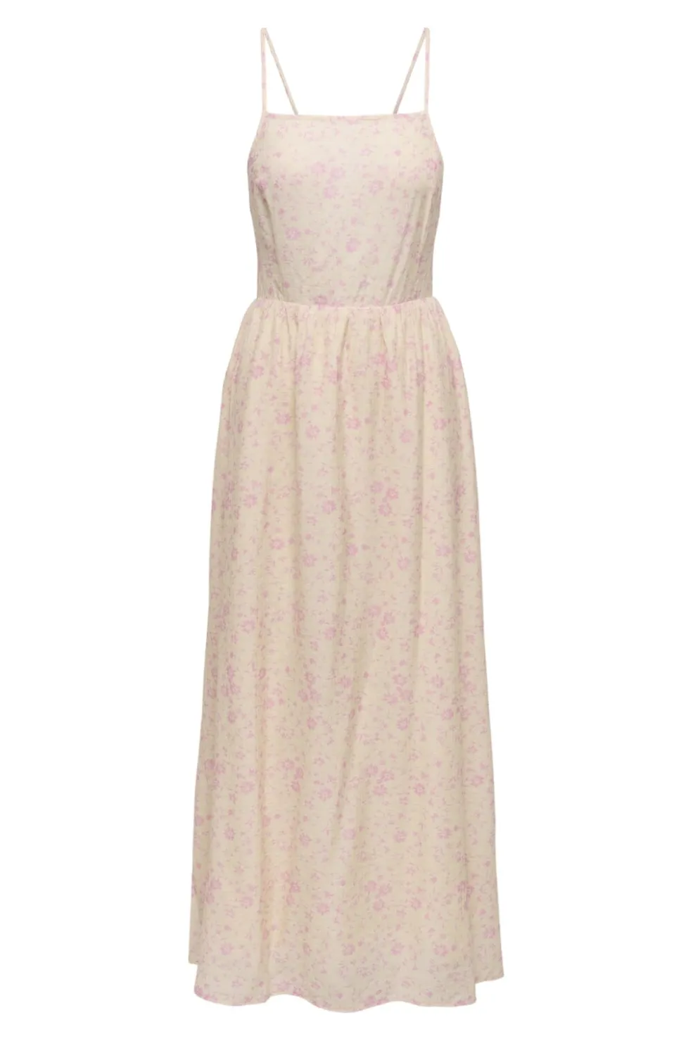 Maxi kjole fra Only i ecru med lyserøde blomster. Kjolen har tynde spaghetti-stropper, en åben ryg med krydsede stropper og en regular fit-pasform.