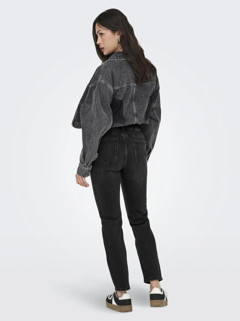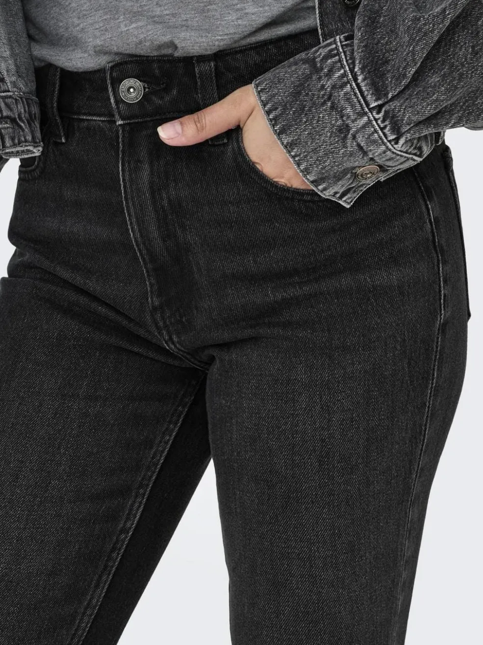 Sorte denimjeans fra Only med høj talje og straight fit. Bukserne har en behagelig pasform med plads omkring lårene og lukkes med både knapper og lynlås.