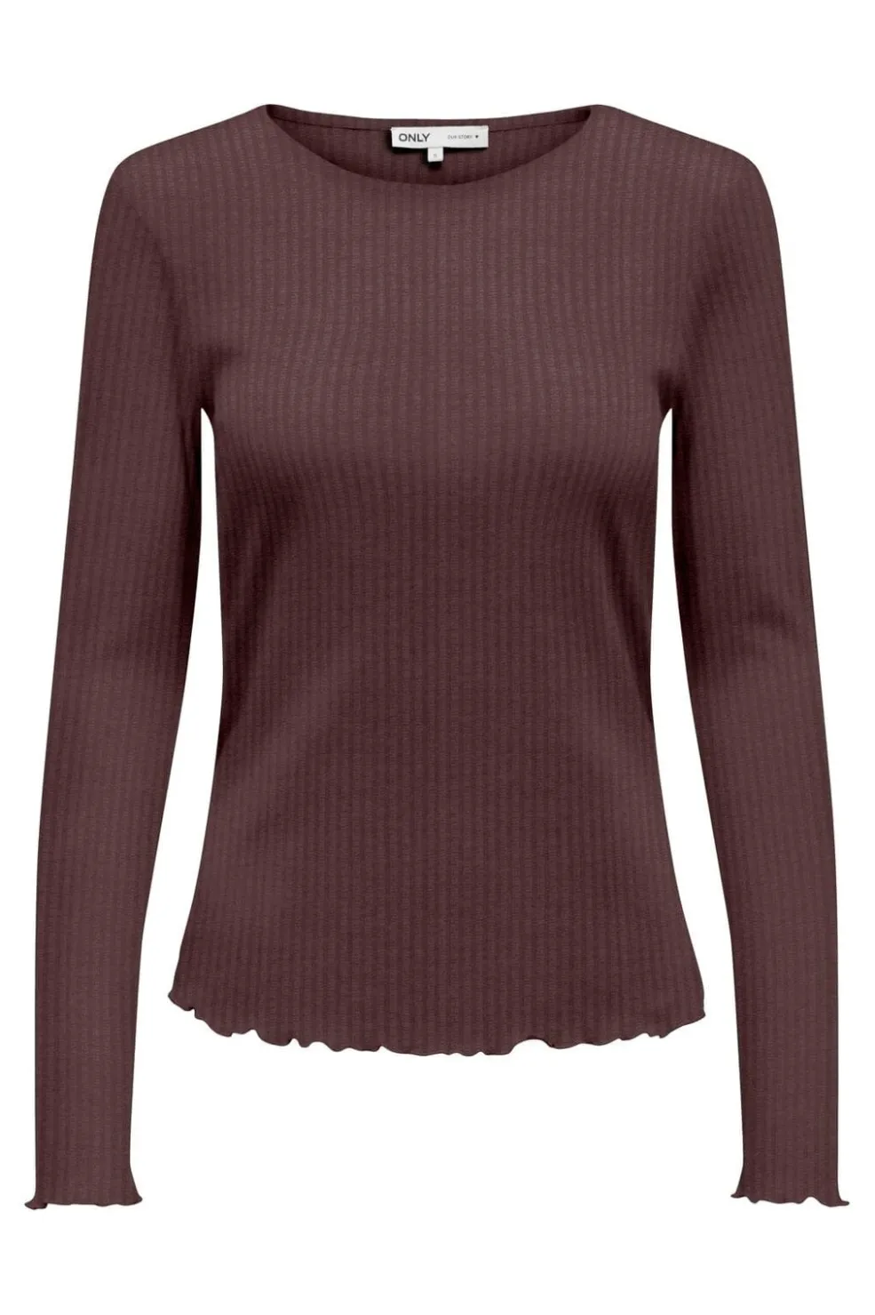 Brun ribstrikket top fra Only med rund halsudskæring og lange ærmer. Toppen har en regular fit-pasform og bølgede kanter ved ærmerne og bunden.