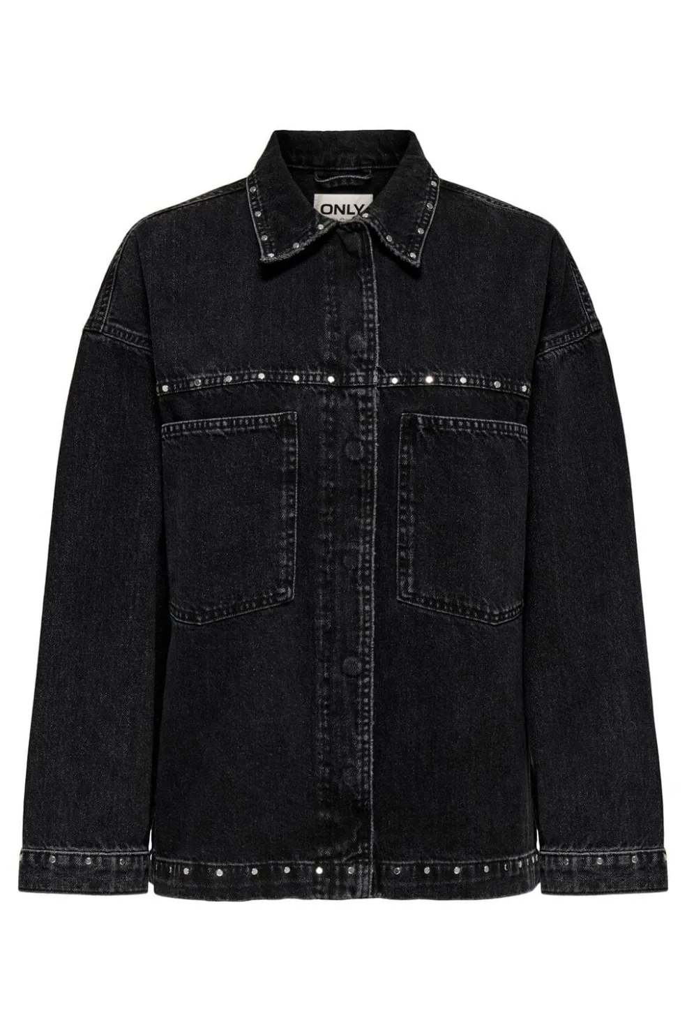 Vasket sort skjorte fra Only med nitteudsmykninger langs kraven, brystlinjen og manchetterne. Skjorten har to brystlommer og en klassisk skjortekrave.