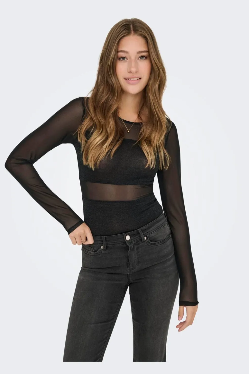 Sort body fra Only med glitrende finish og gennemsigtige detaljer. Bodyen har en rund hals og lange ærmer med knaplukning, der gør den nem at tage af og på.