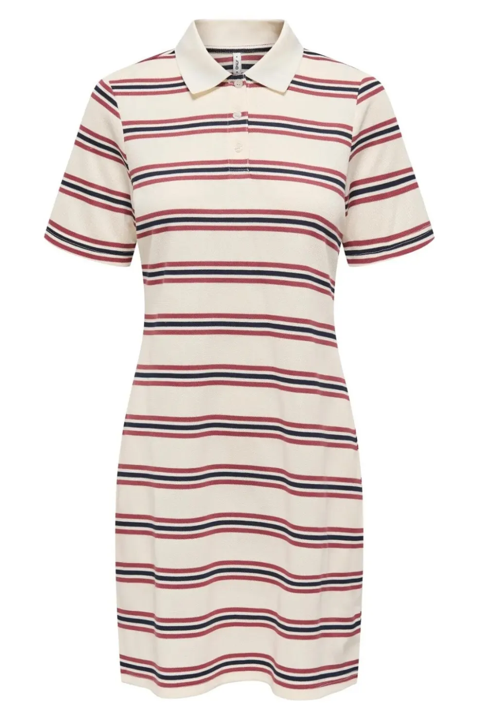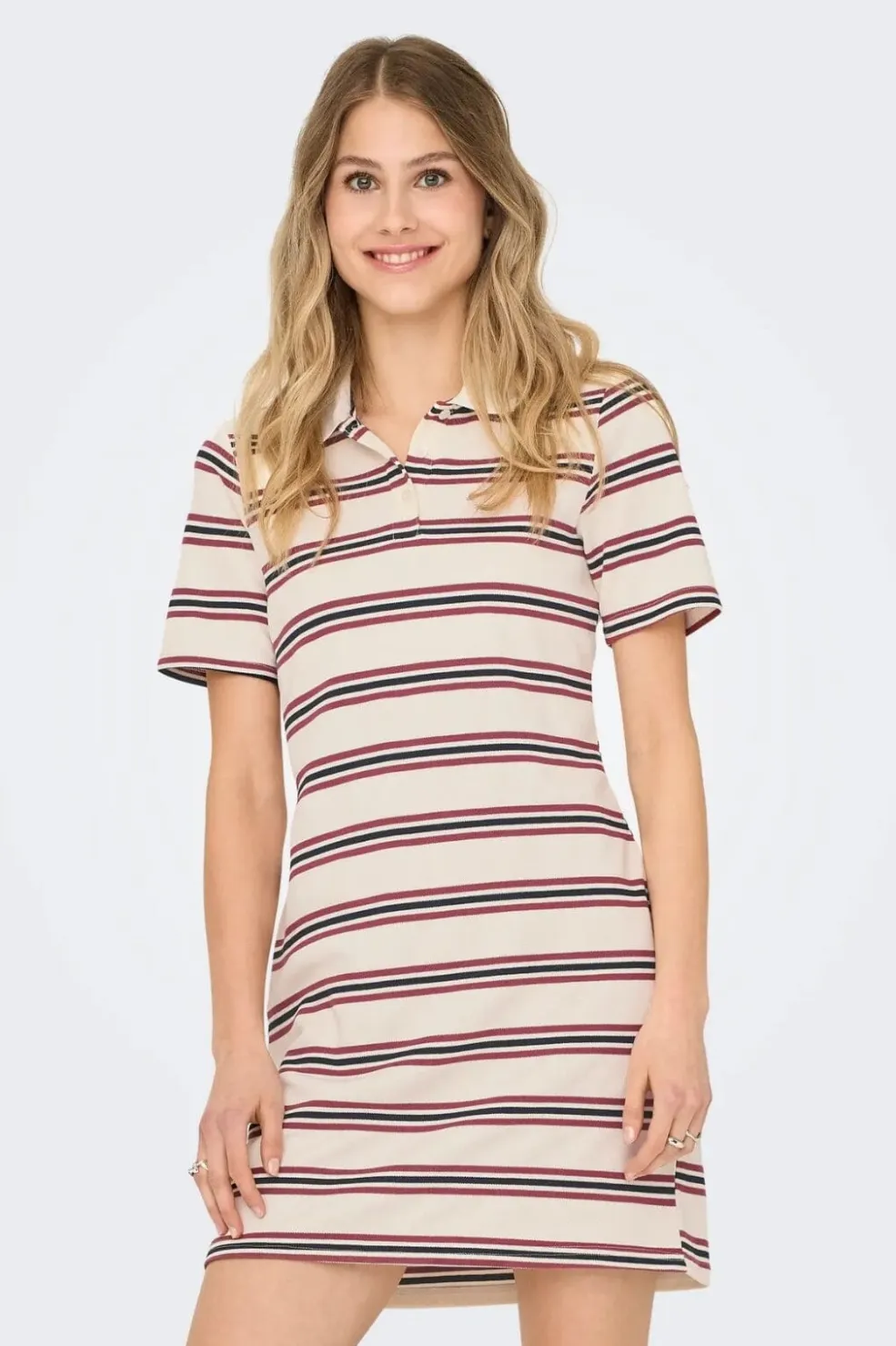 Stribet polokjole fra Only i hvid med mørkeblå og vinrøde striber. Kjolen har en polokrave med knaplukning og korte ærmer i et sporty design.