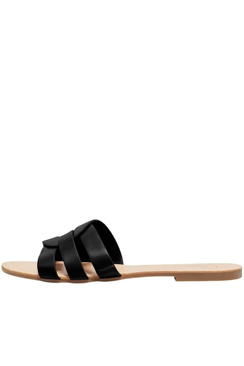 Sorte slip-on sandaler fra Only Shoes med krydsende remme og uforet design. Sandalerne har en mandelformet tå og er fremstillet af syntetisk læder med diskret skær.