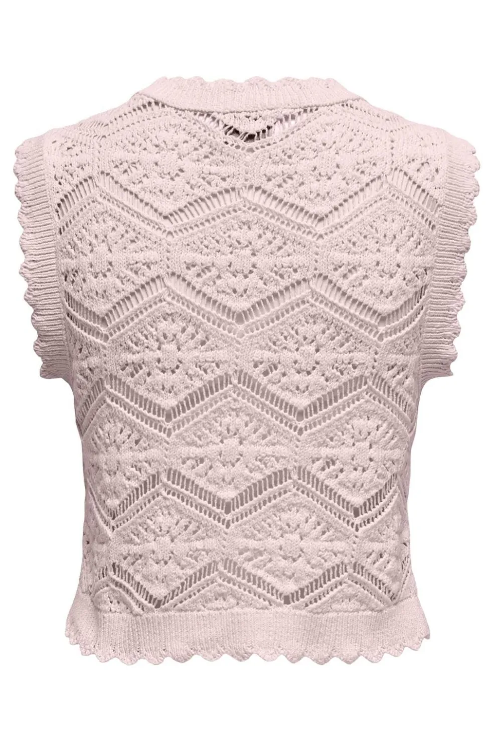 Ærmeløs strikket top fra Only i candy pink. Toppen har et hulmønster med bølgede kanter og dekorative syninger, der skaber et fint mønster gennem hele designet.