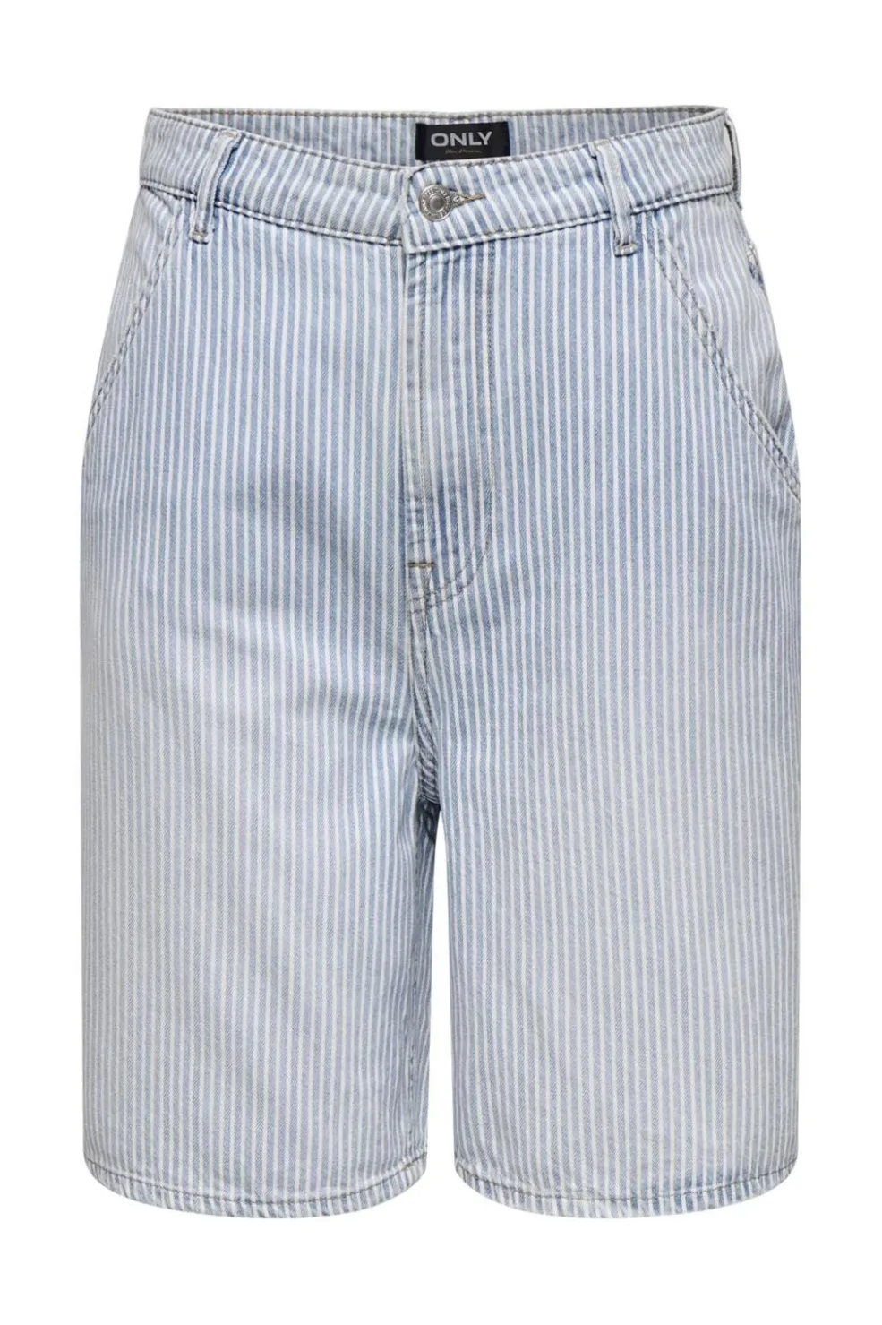 Stribede shorts fra Only i lyseblå denim med hvide striber. Shortsene har en løs pasform og når til midt på låret. De har lynlås og knapper i taljen.