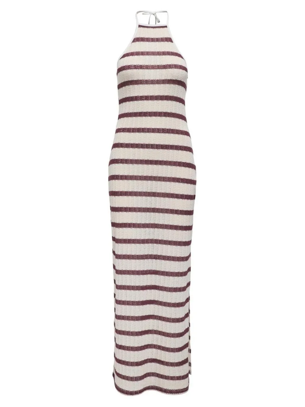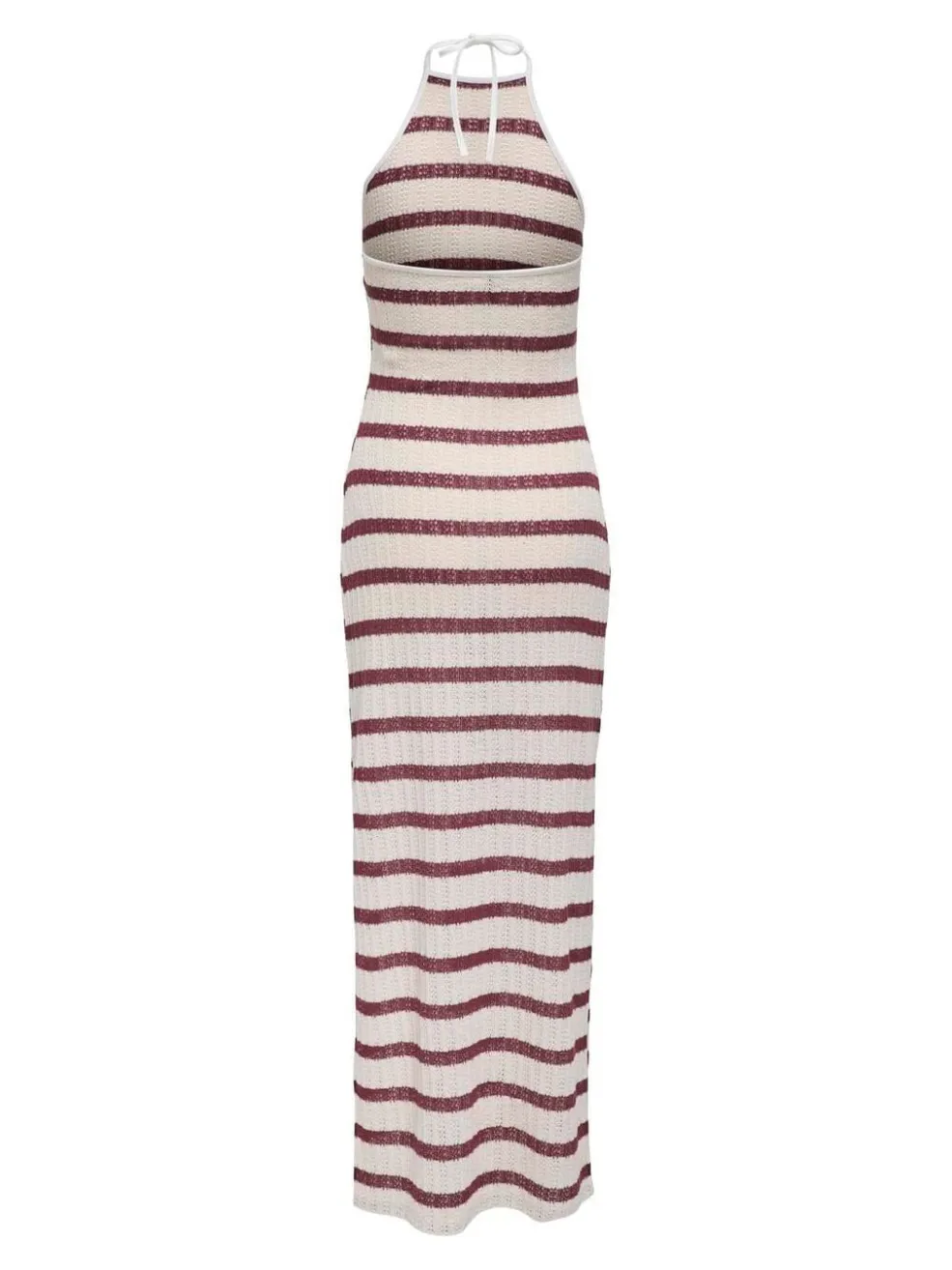 Lang kjole fra Only med hvide og burgunder striber. Kjolen har halterneck-design med bindebånd og går til anklerne. Den har en regular pasform og er fremstillet i en let bomuldsblanding.