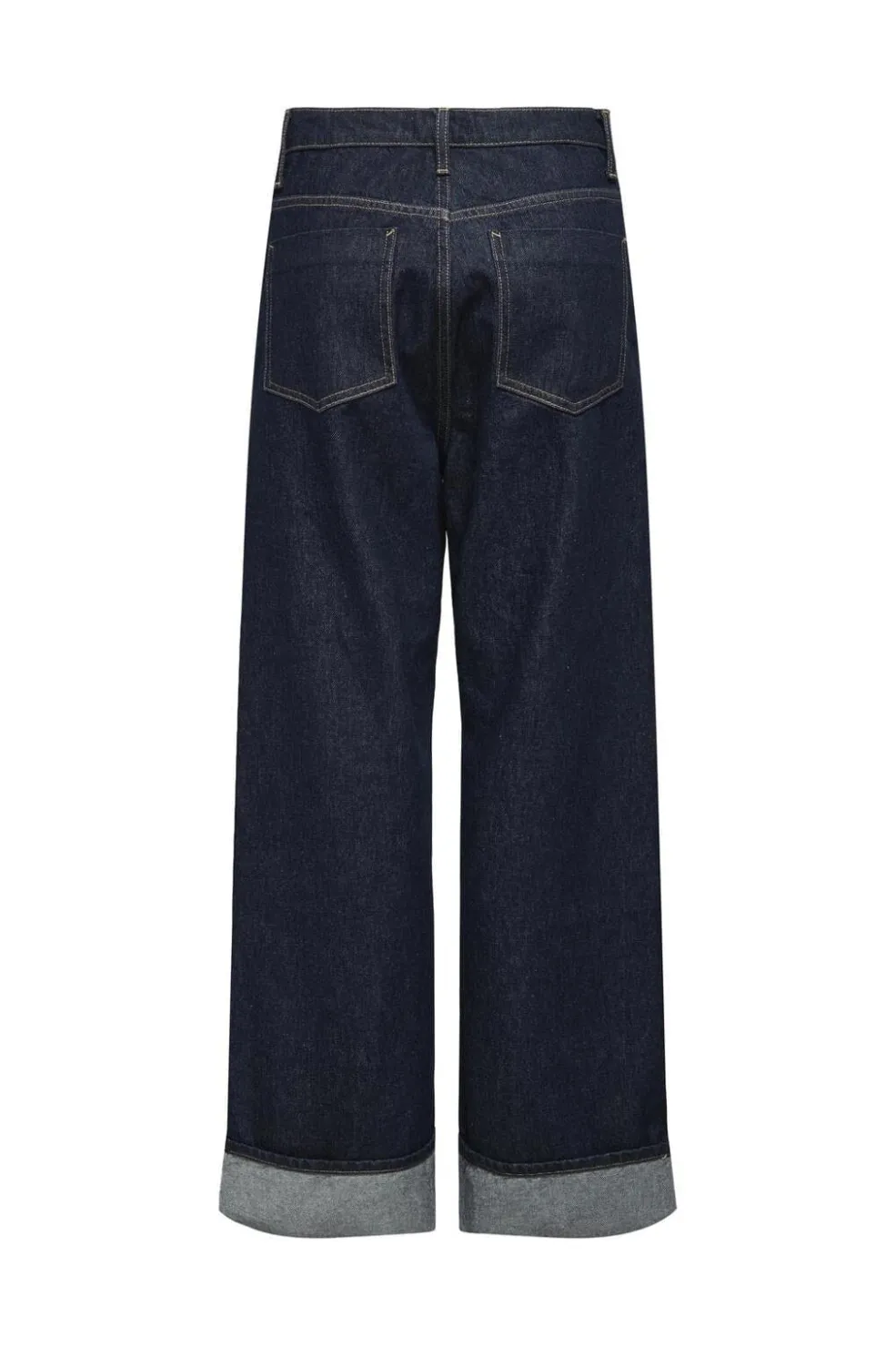 Mørkeblå jeans fra Only med høj talje og vide ben. De har opsmøg ved benene og en løs pasform, der giver god bevægelsesfrihed.
