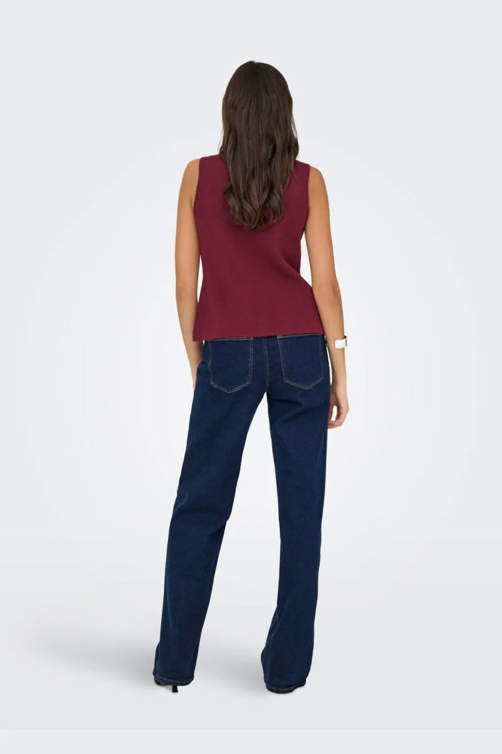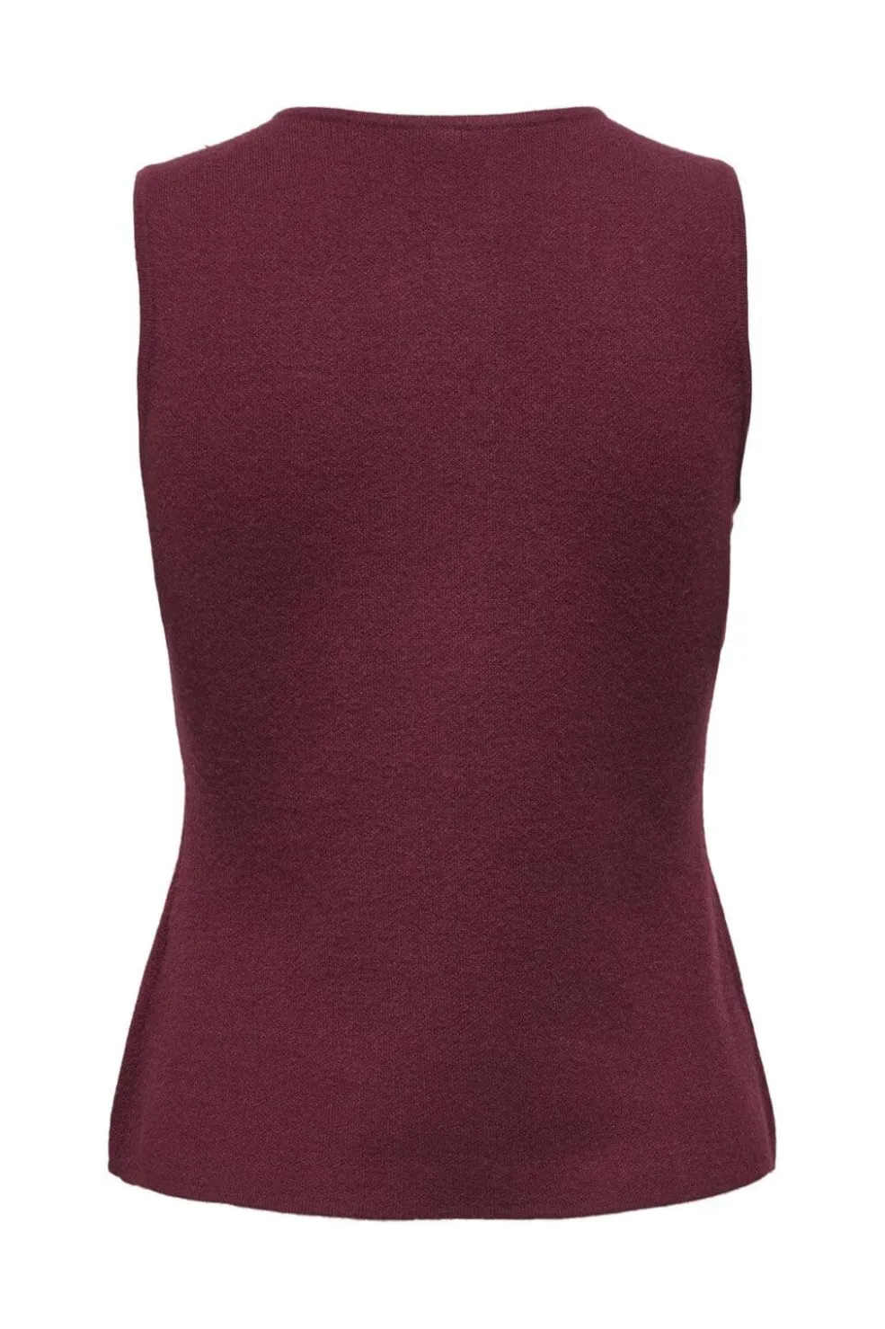 Ærmeløs vest fra Only i en dyb bordeauxrød nuance. Vesten har en rund halsudskæring og sølvfarvede knapper foran. Den er strikket i en blød kvalitet med regular fit.