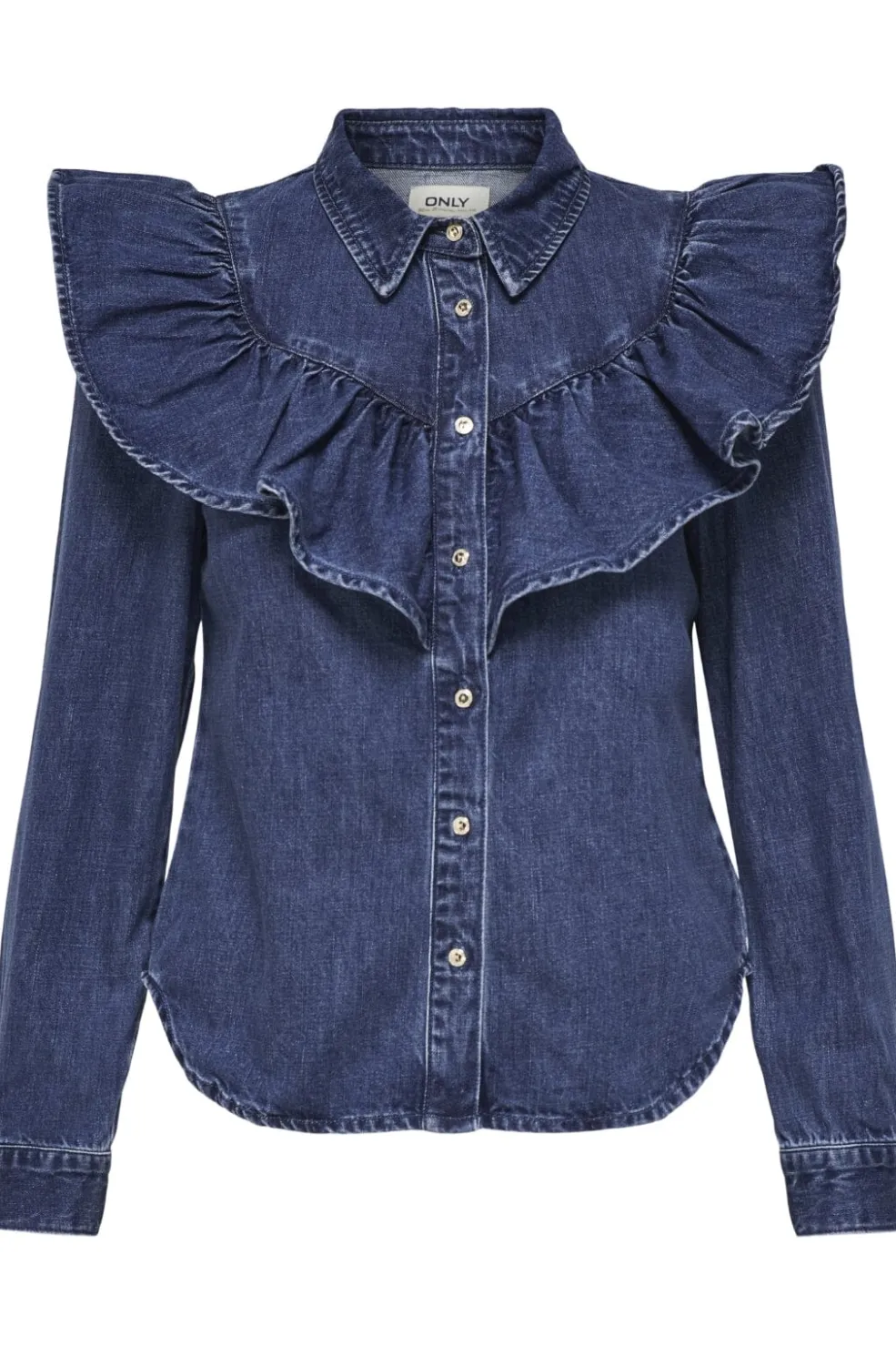 Mørkeblå denimskjorte fra Only med store flæsedetaljer på brystet. Skjorten har en afslappet pasform, skjortekrave og lange ærmer med knapper ved manchetterne.