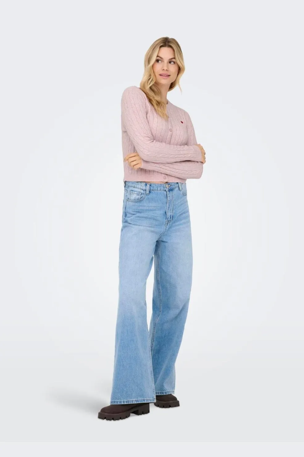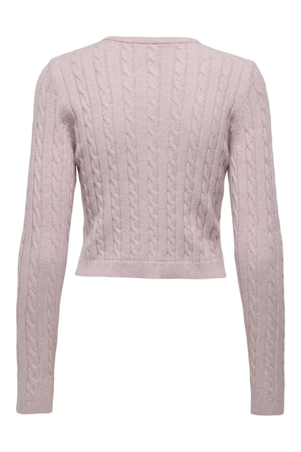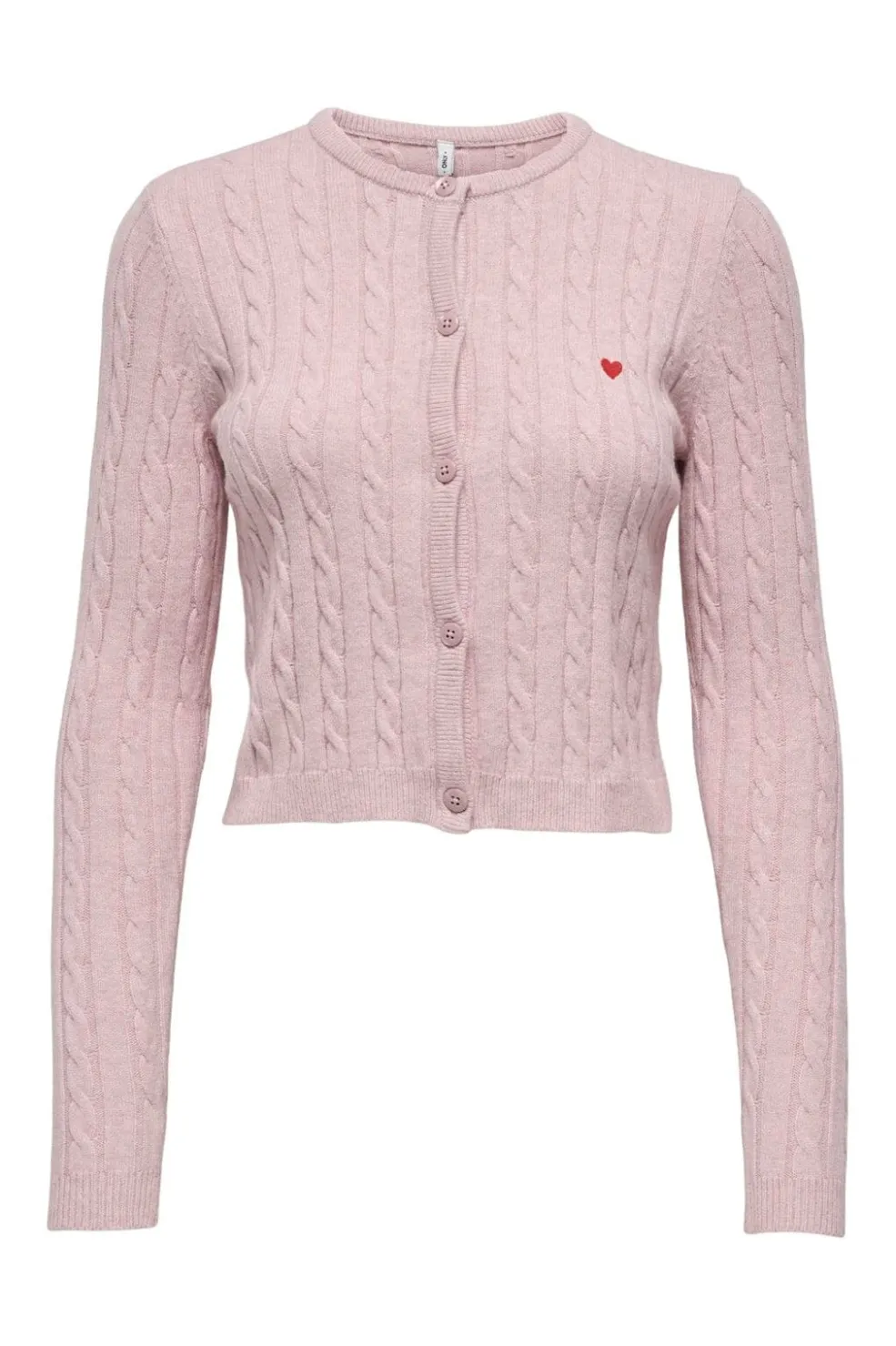 Lys lilla cardigan fra Only med kabelstrikmønster og et lille rødt hjertebroderi på brystet. Cardiganen har knaplukning og ribstrikkede manchetter.