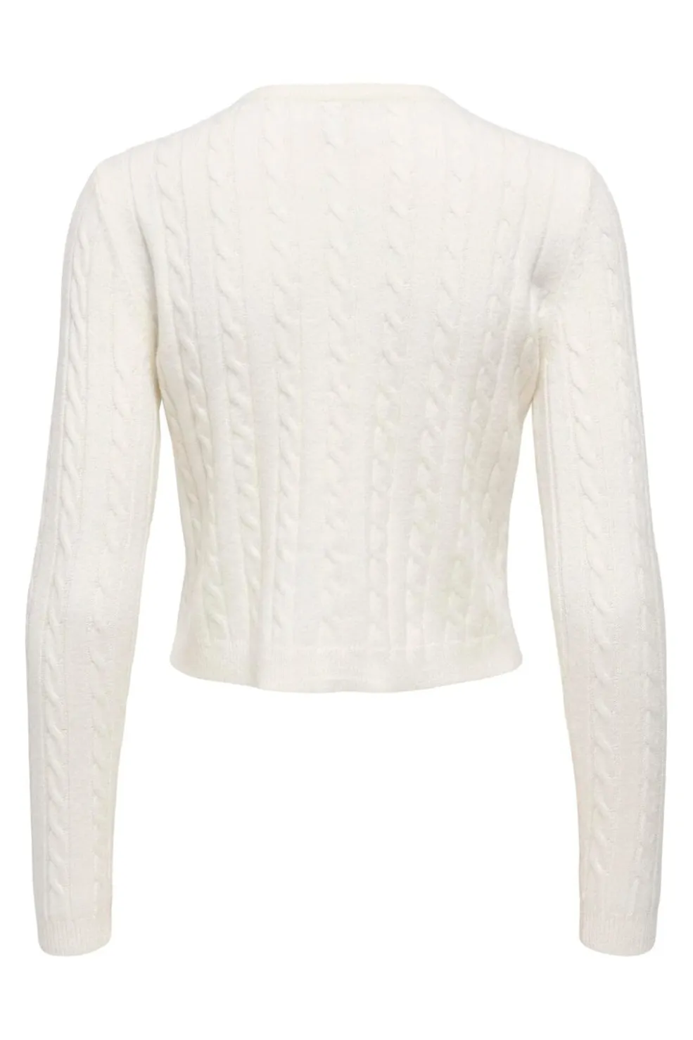 Kabelstrikket cardigan fra Only i en cremelignende off-white farve med rødt hjertebroderi på brystet. Cardiganen har rund hals og kabeldetaljer.