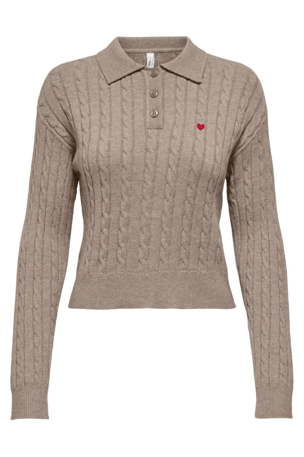Strikket polo fra Only i en lys beige nuance med kabelmønster over hele trøjen og et lille rødt hjertebroderi på brystet.