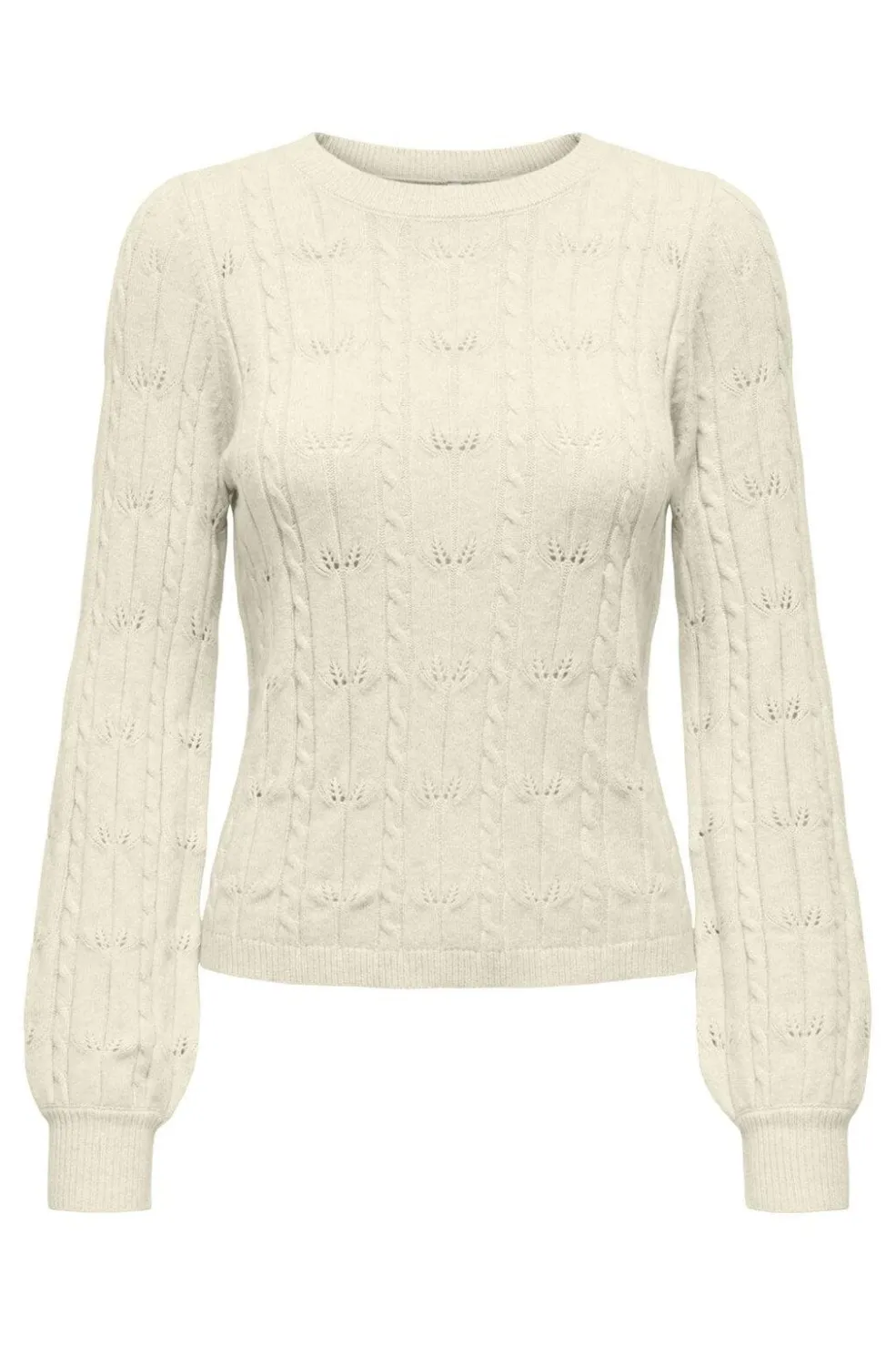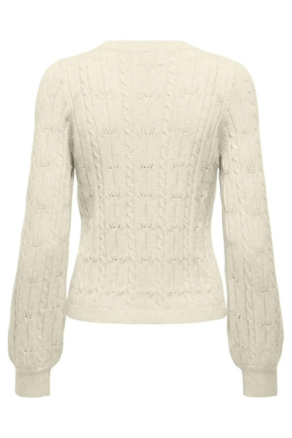 Striktrøje fra Only i en lys cremehvid nuance. Trøjen har et struktureret mønster med dekorative syninger og en rund halsudskæring med ribkant.