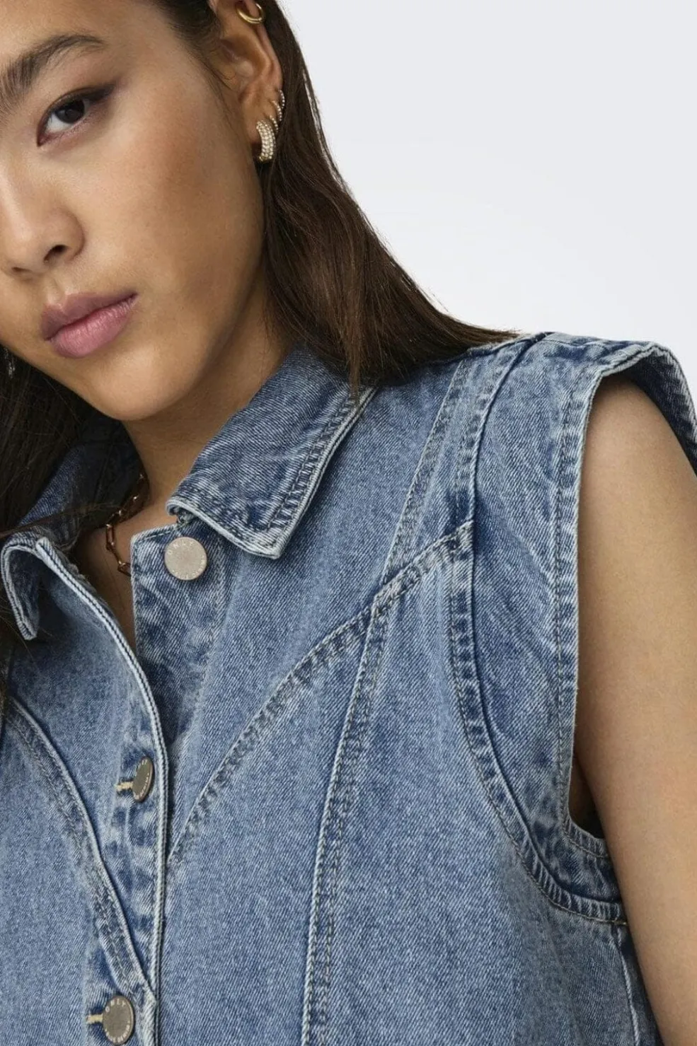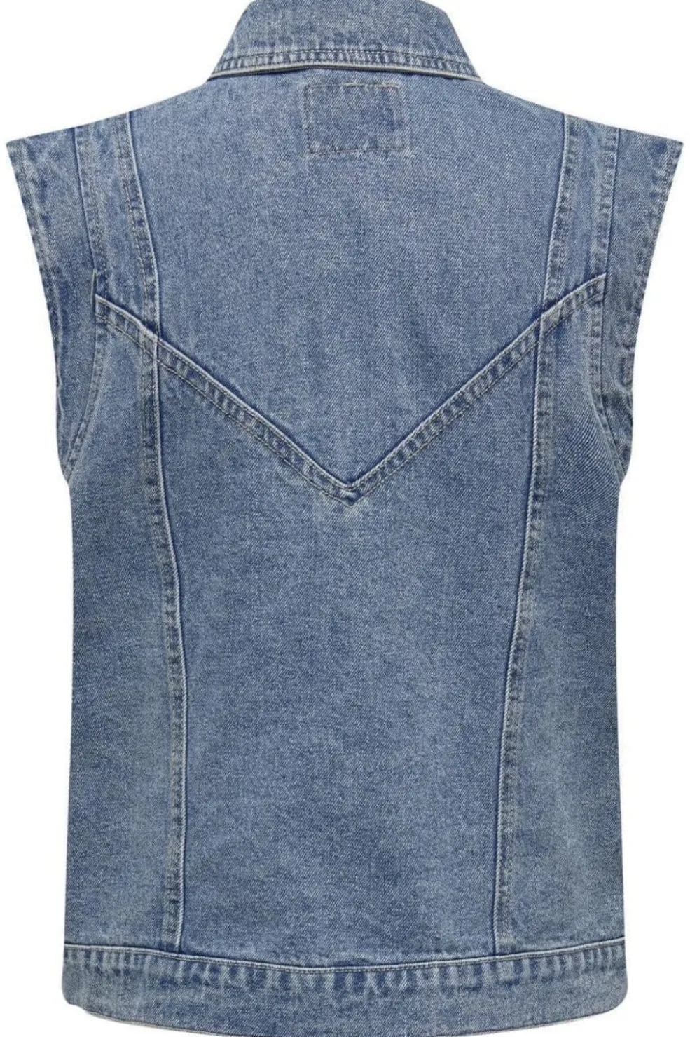 Denimvest fra Only i mellemblå. Den ærmeløse vest har skjortekrave, knaplukning foran og to forlommer. Loose fit med god plads til bevægelse.