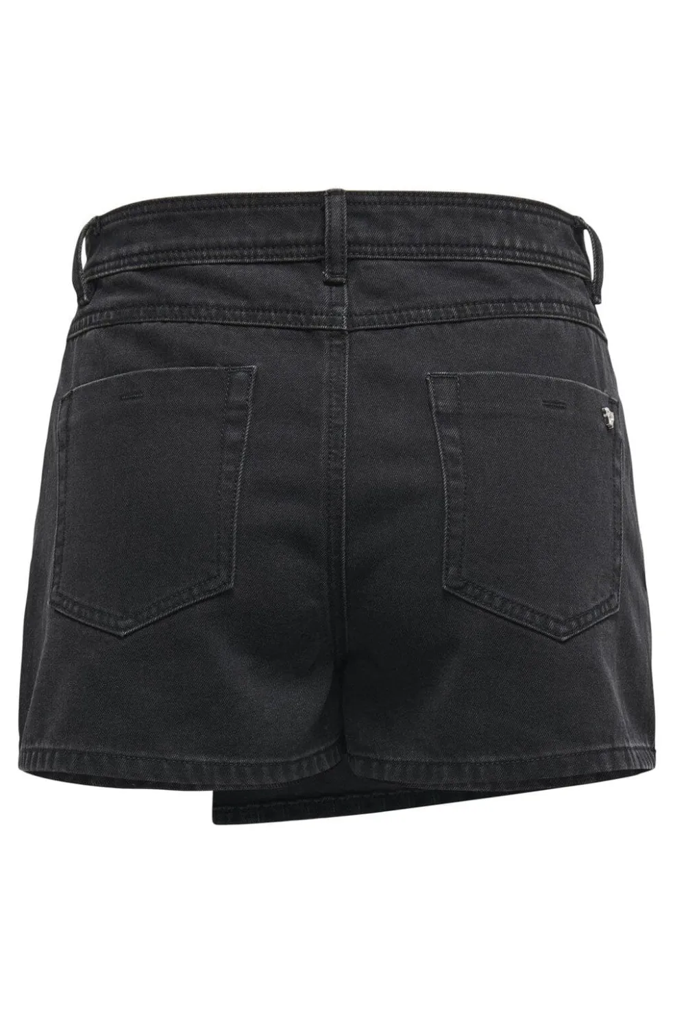 Sort denim skort fra Only med mellemhøj talje og bæltestropper. Den asymmetriske front har tre synlige knapper, og skorten kommer med både for- og baglommer.