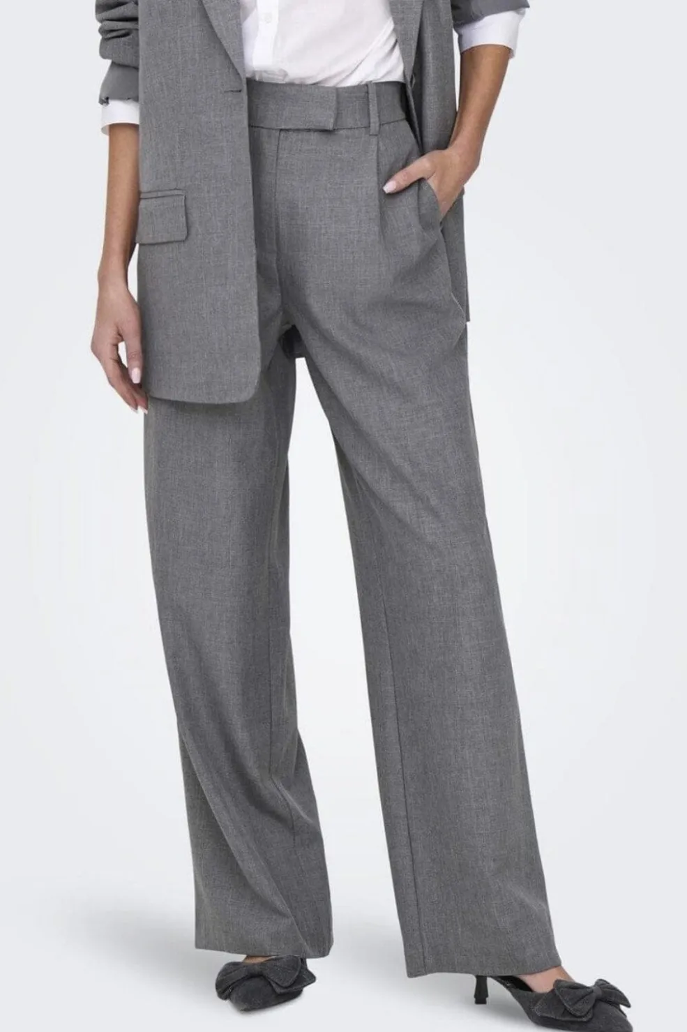 Grå bukser fra Only med lige ben og skræddersyet snit. Bukserne har en klassisk meleret overflade og er lavet i et let materiale med stretch.