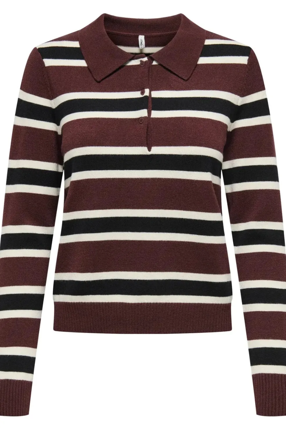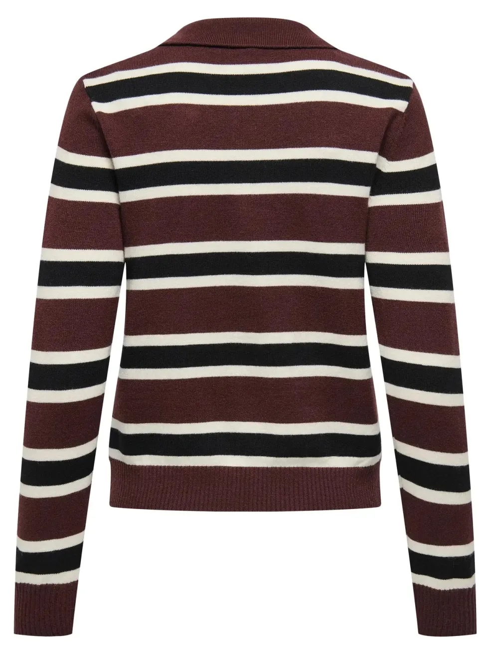 Stribet polo-strik fra Only i brune og bordeaux nuancer med sorte og hvide striber. Strikken har en polo-krave og lange ærmer.