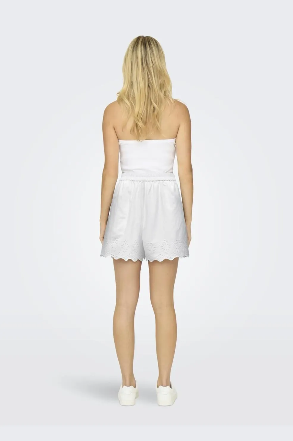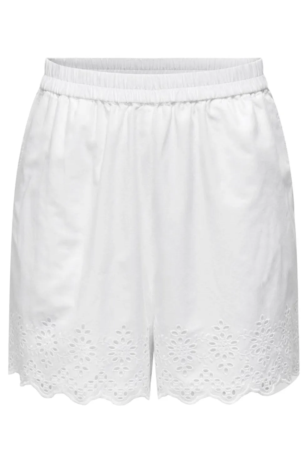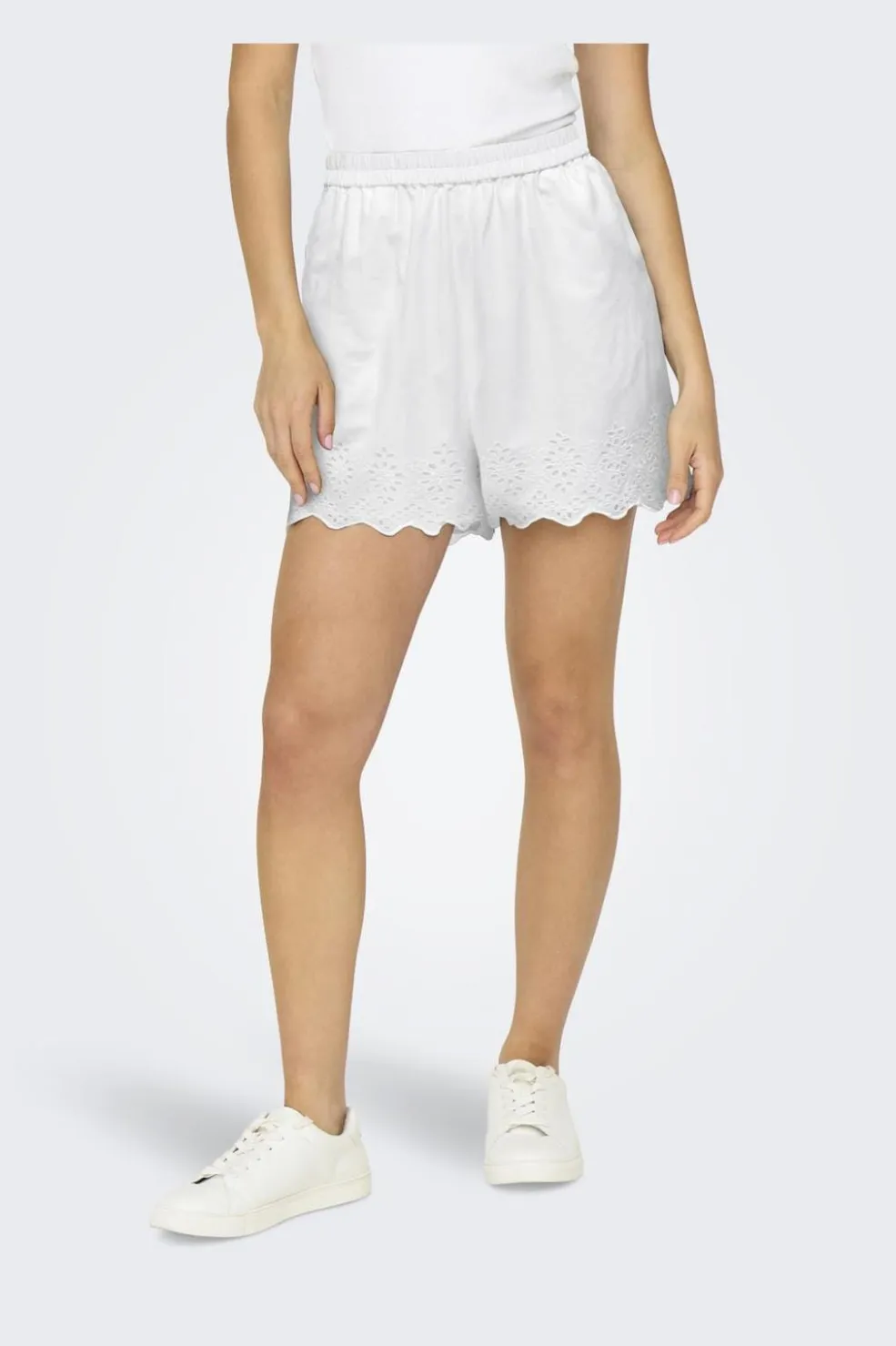 Hvide shorts fra Only med broderede blomster ved kanten. Shortsene har en løs pasform og elastik i taljen, hvilket giver god bevægelsesfrihed.