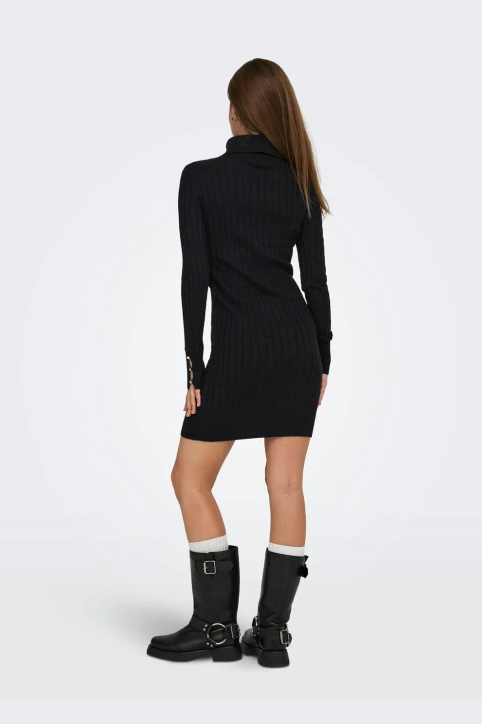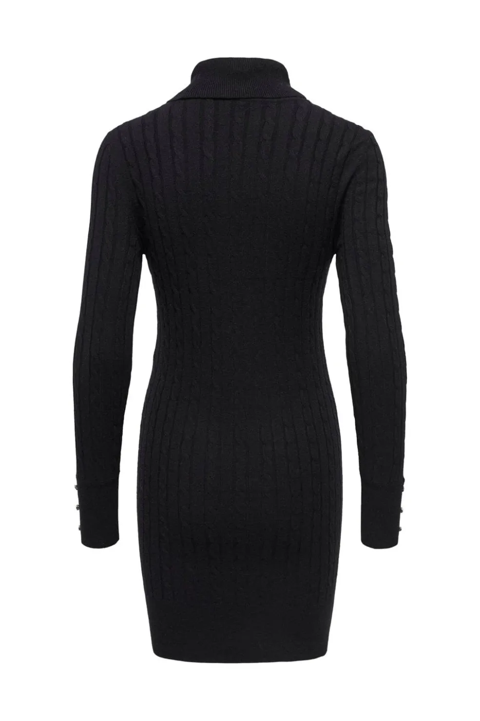 Sort strikkjole fra Only med kabelstrikmønster. Kjolen har en rullekrave og lange ærmer med knappedetaljer på manchetterne.