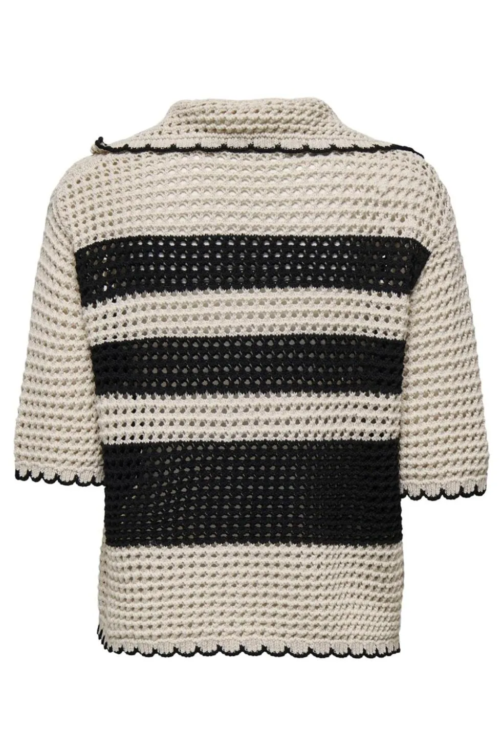 Stribet cardigan fra Only i ecru og sort. Den har en bølget krave og 3/4-ærmer. Cardiganen er strikket i et luftigt mønster med knaplukning foran.