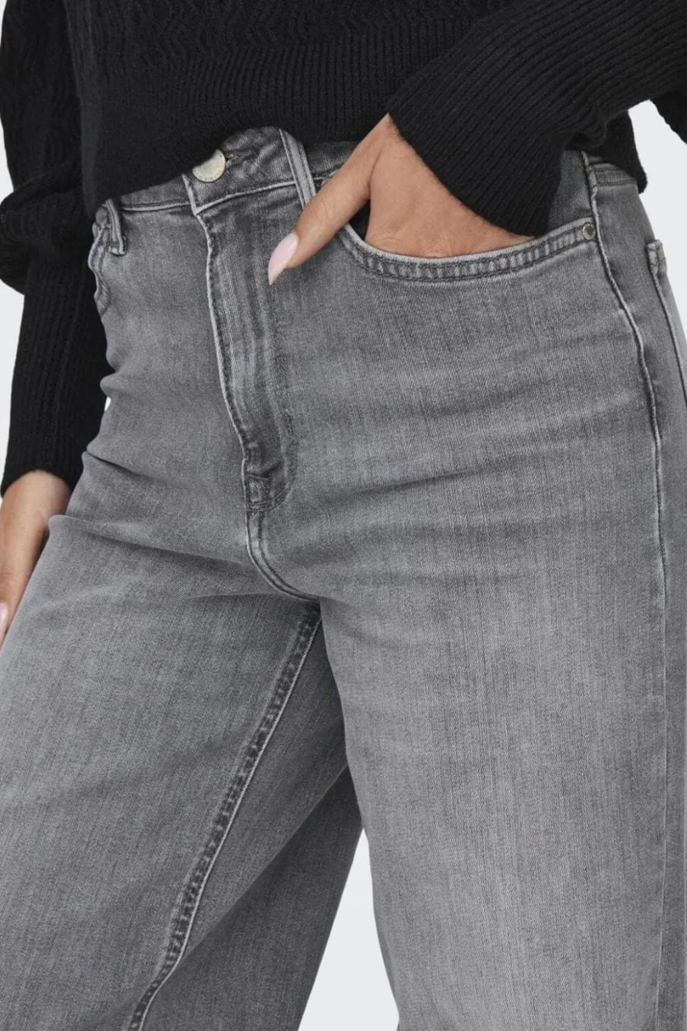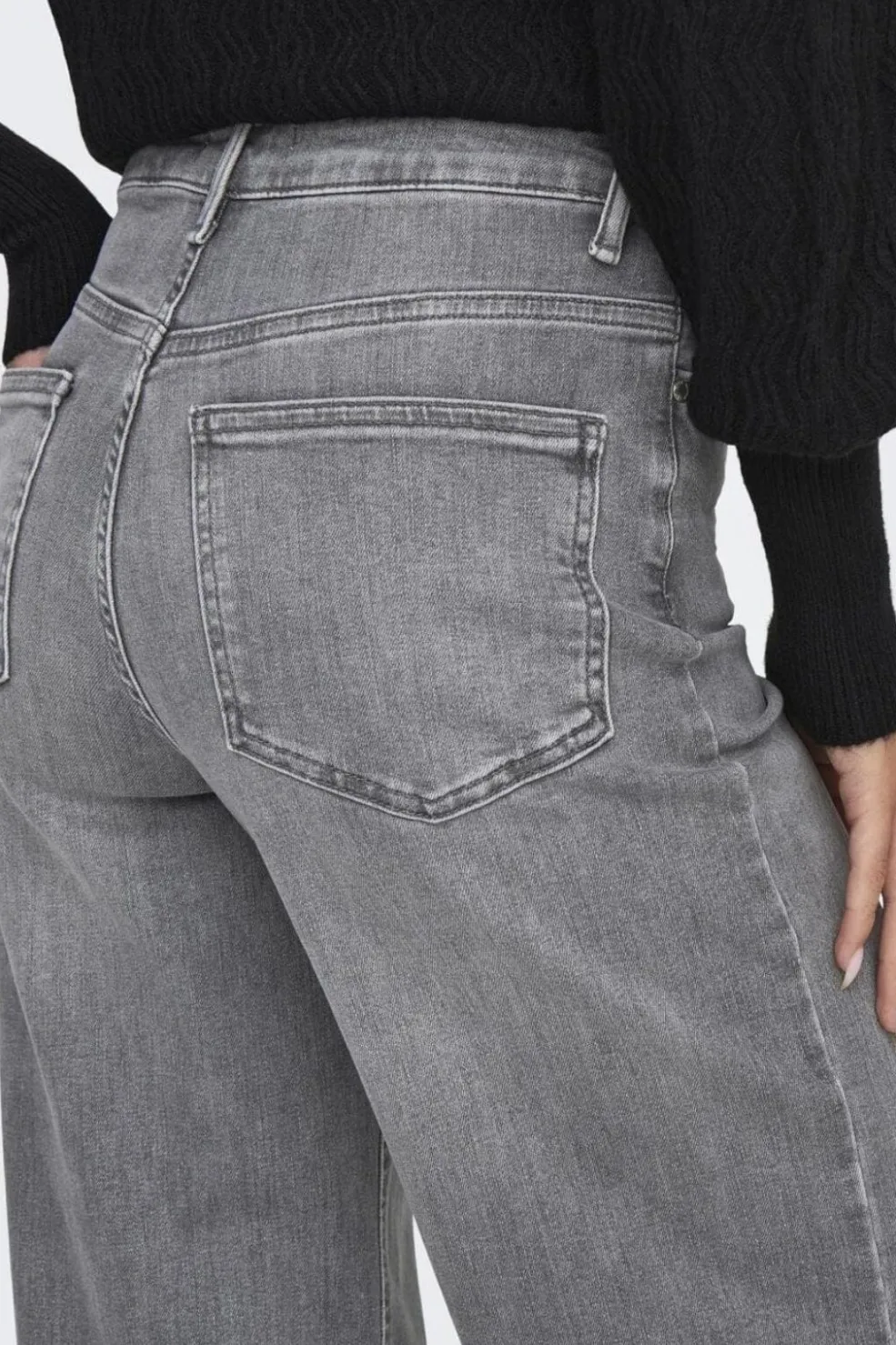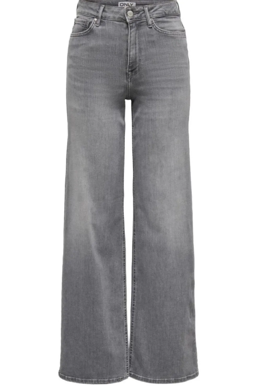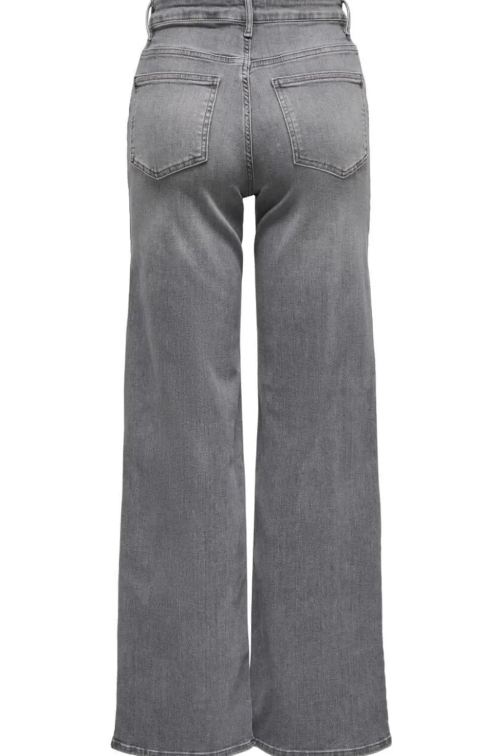 Lysegrå denimbukser fra Only med høj talje og vide ben. Bukserne har en løs pasform fra hofte til ankel og er udstyret med for- og baglommer samt bæltestropper.