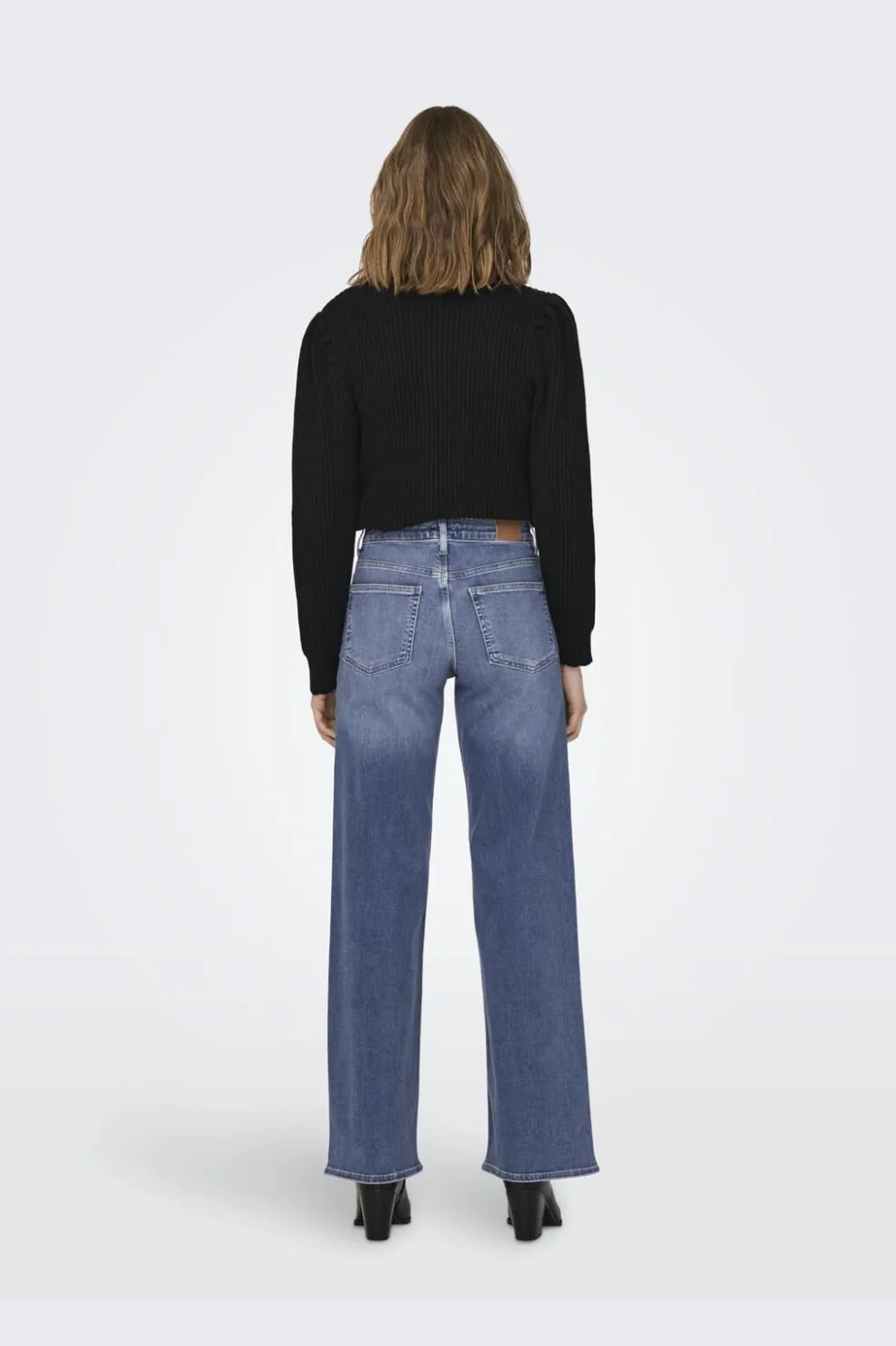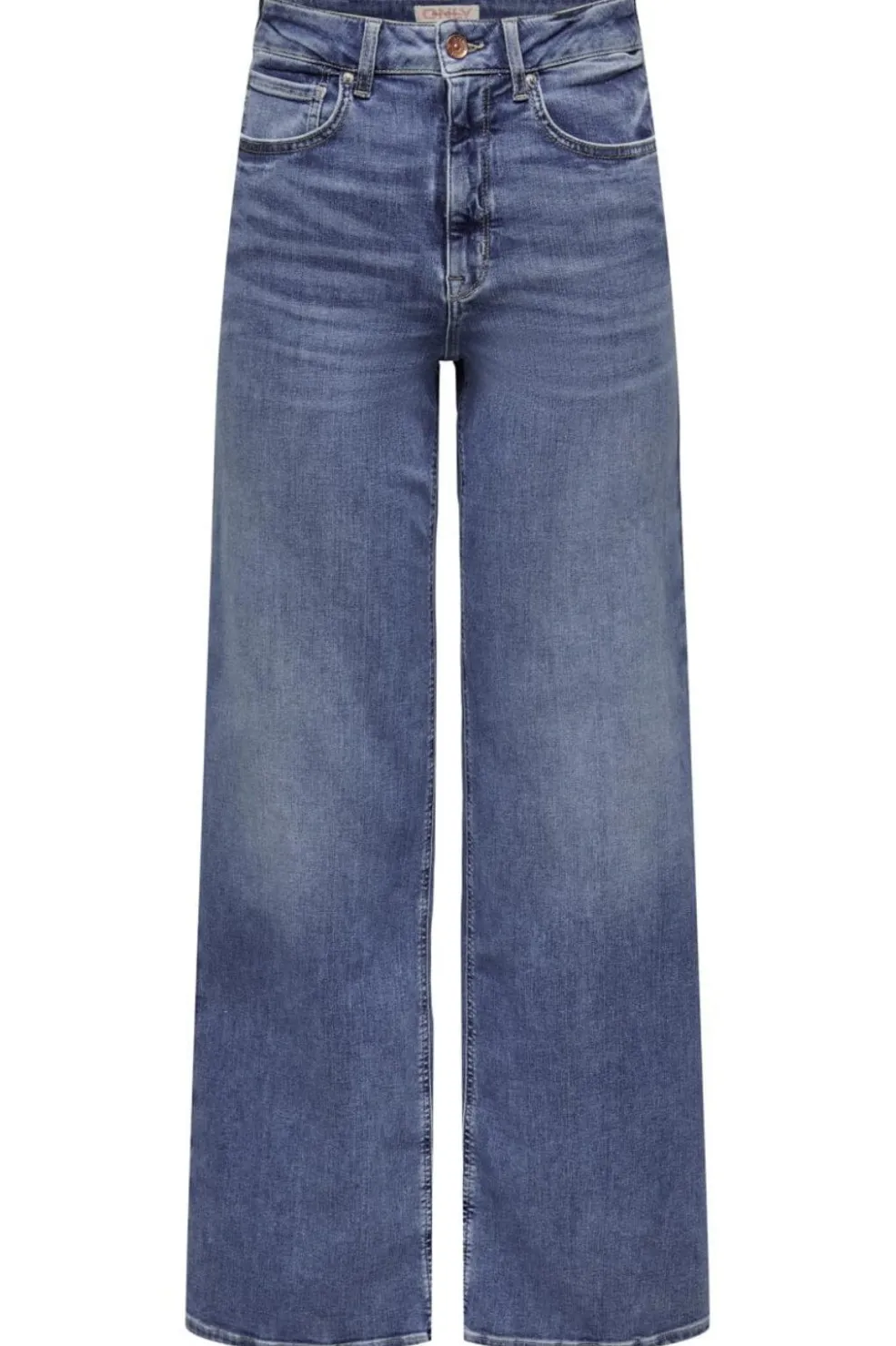 Mellemblå jeans fra Only med høj talje og bæltestropper. Den brede pasform giver god plads fra hofte til ankel, og jeansene har møntlomme og lynlåslukning.