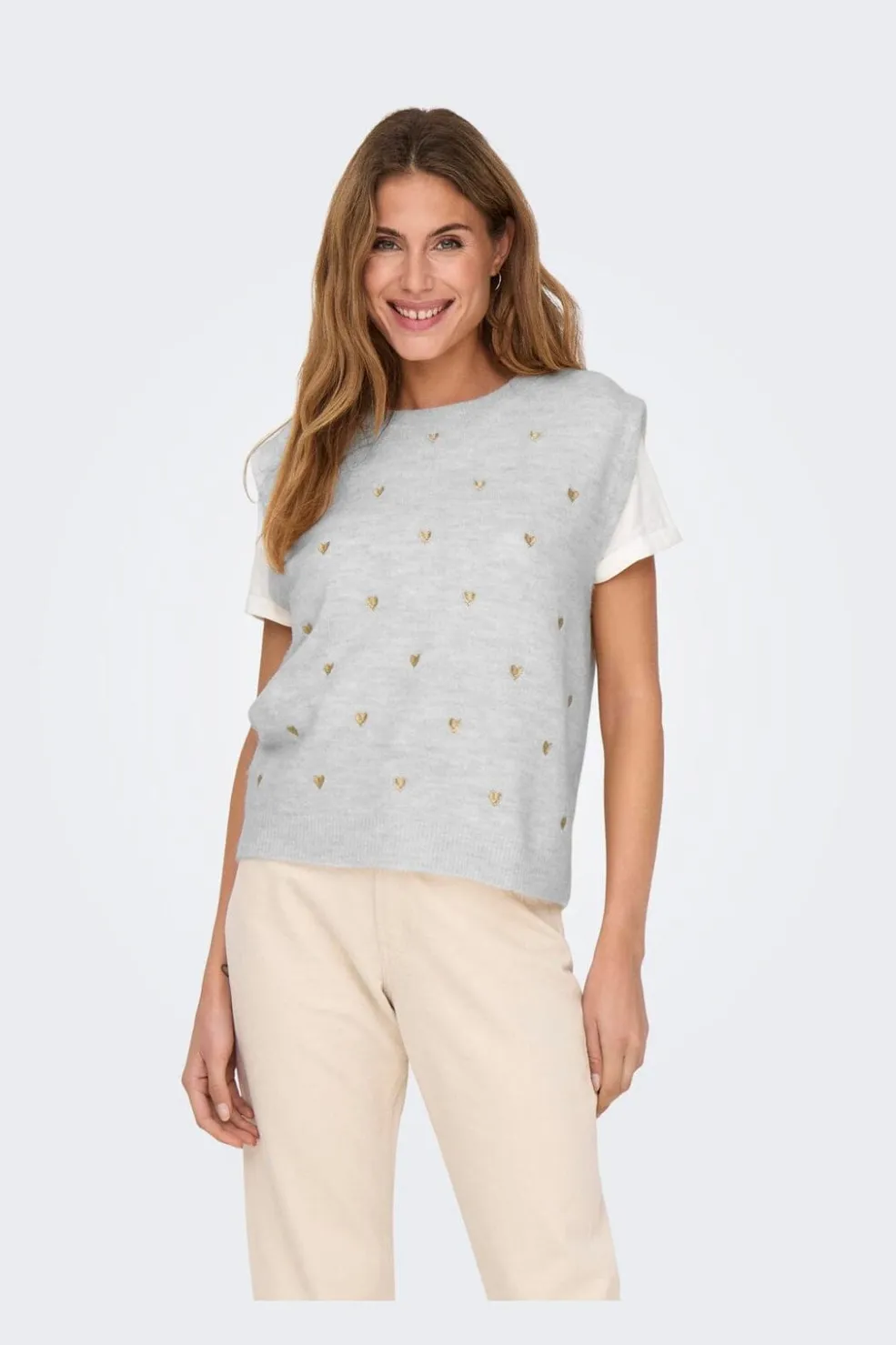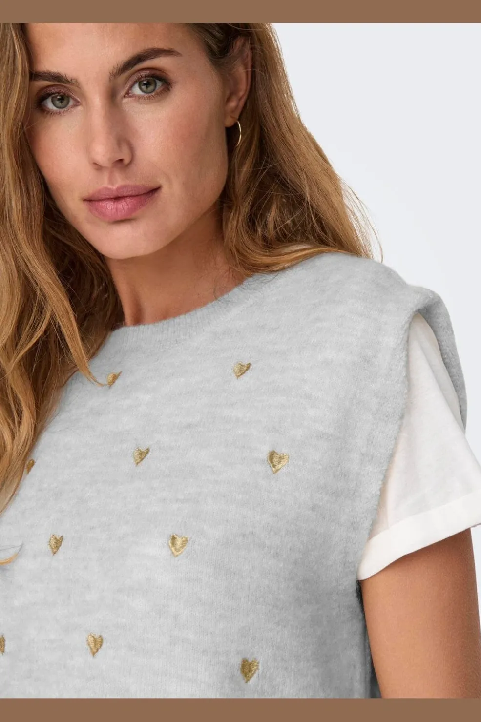 En strikket vest fra Only i lys grå nuance med broderede gyldne hjerter. Vesten har en O-halsudskæring og et ærmeløst design med ribmanchetter.