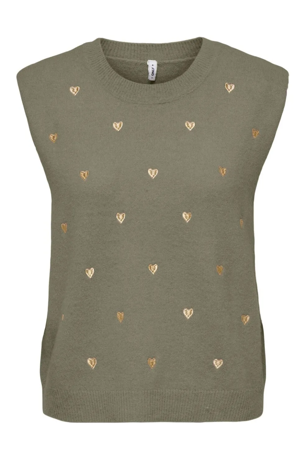 Ærmeløs vest fra Only i khakigrøn farve med broderede gyldne hjerter spredt over stoffet. Vesten har en rund halsudskæring og ribmanchetter.