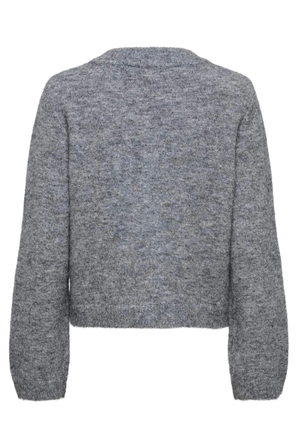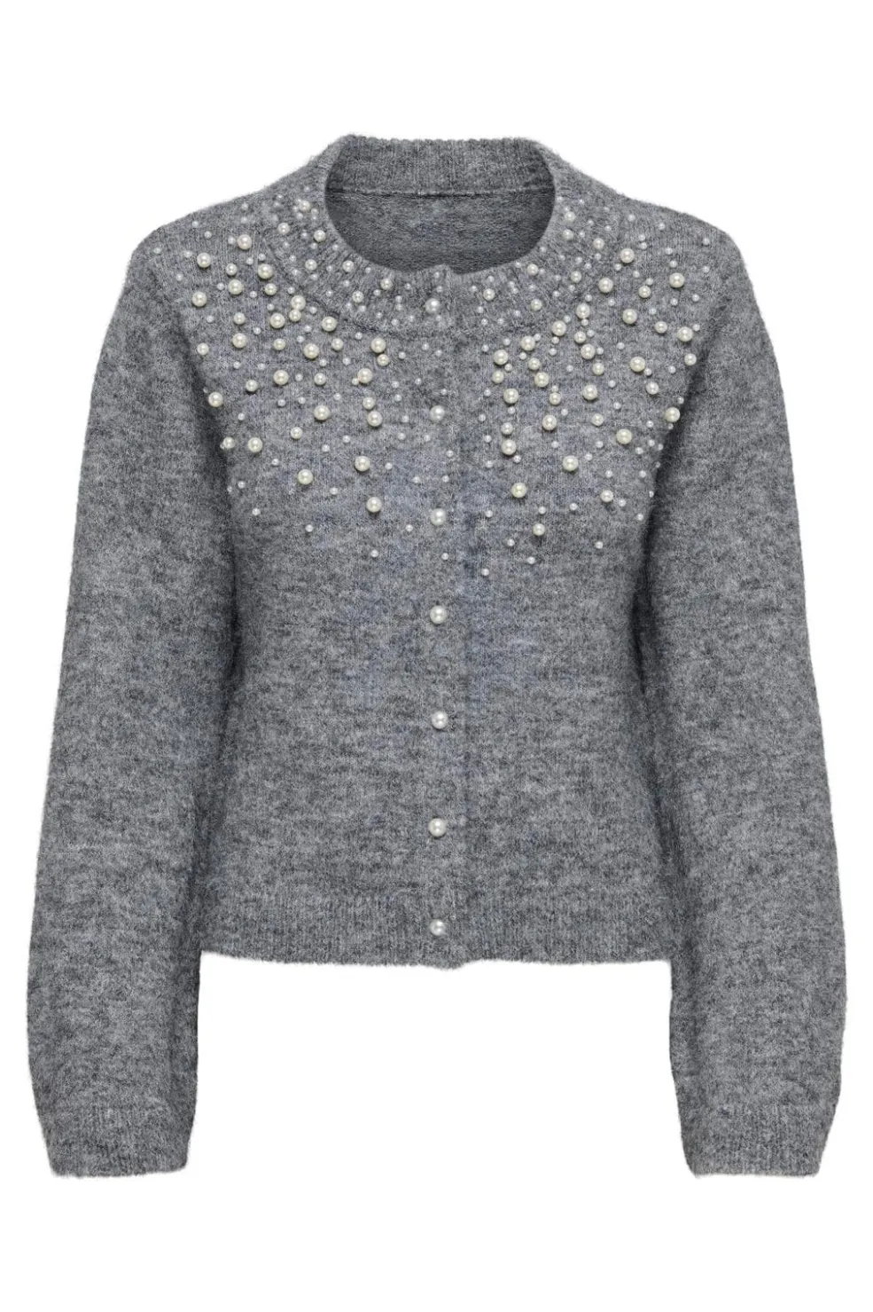Grå cardigan fra Only med perledetaljer på forsiden. Cardiganen har rund hals, lange ærmer med ribmanchetter og lukkes med knapper.