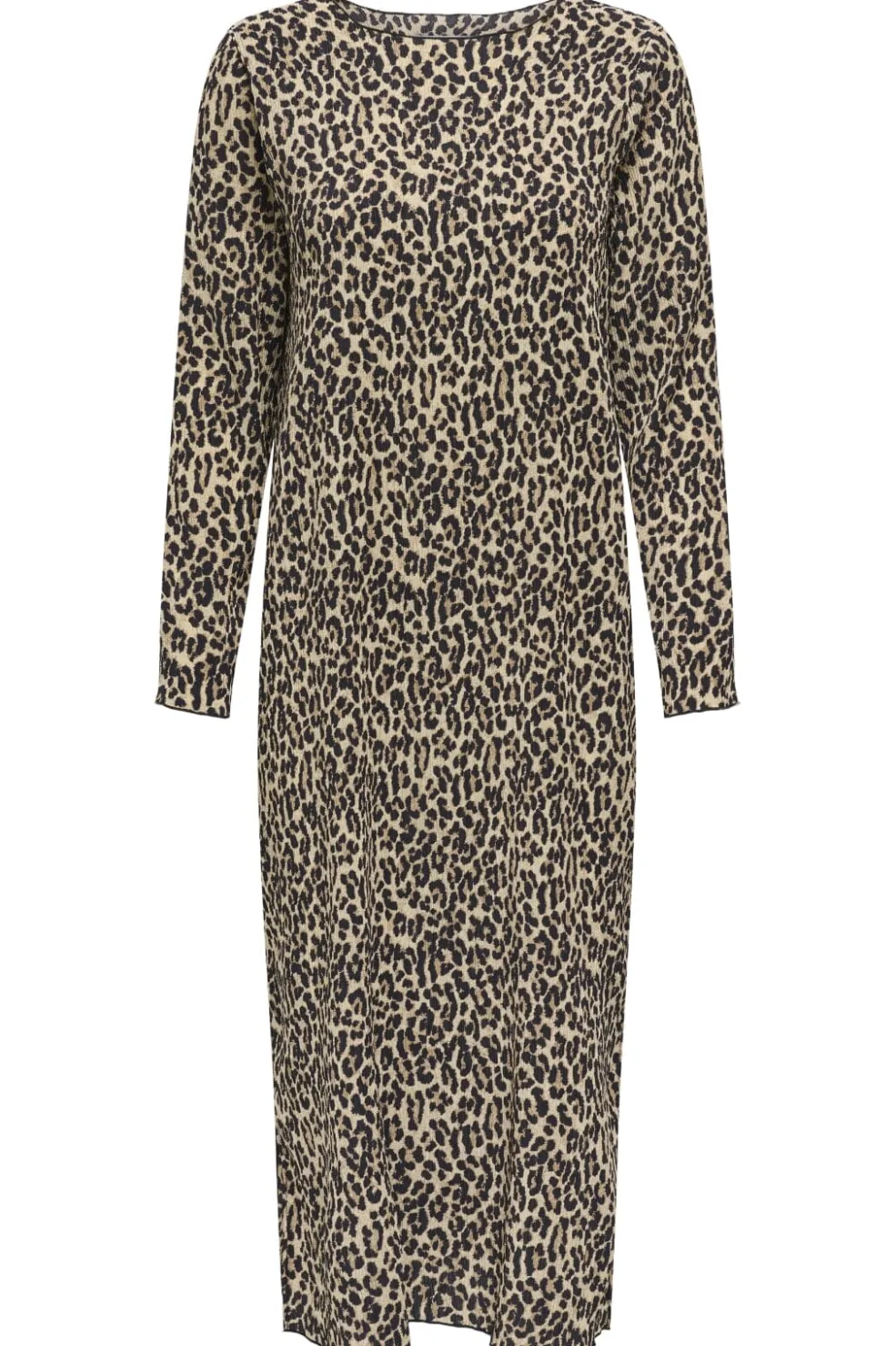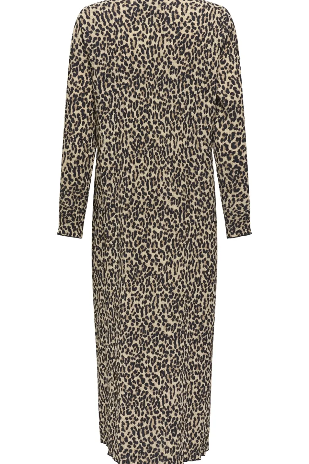 Langærmet kjole fra Only i brun og beige med leopardprint. Kjolen har en løs pasform og går til midt på læggen med en rund halsudskæring.