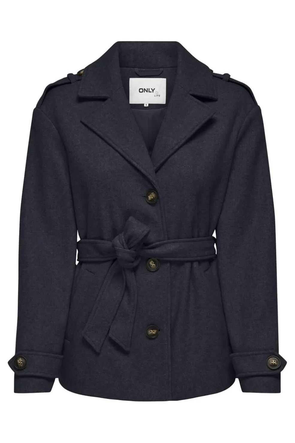 Kort trenchcoat fra Only i en mørkeblå melange-nuance. Jakken har skjortekrave, knapper foran og et bælte i taljen. Det forede materiale giver god komfort.