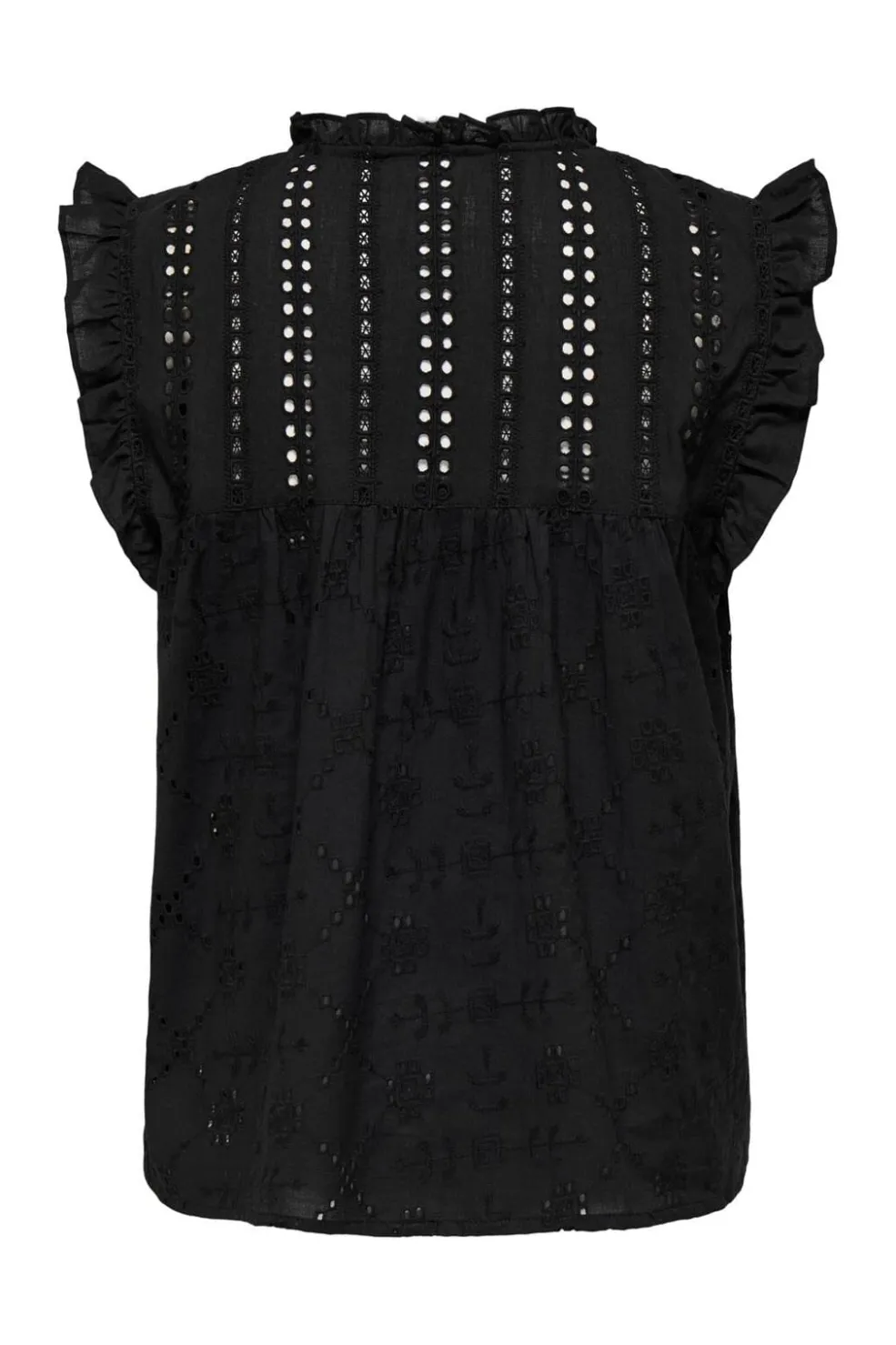 Sort ærmeløs top fra Only med broderi og flæsekanter. Toppen har en rund hals med bindebånd og et øjlet mønster, der går igen i stoffet.