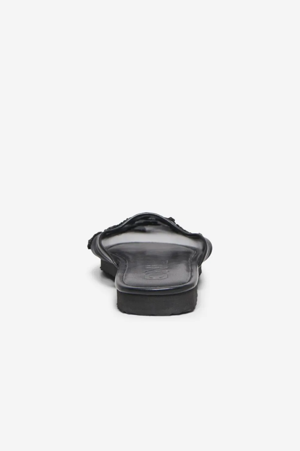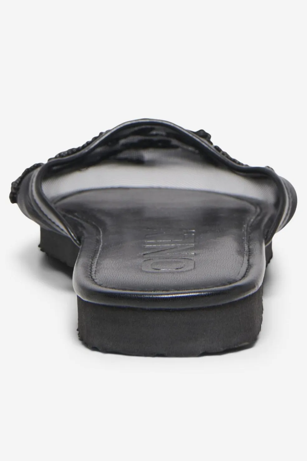 Sorte slippers fra Only Shoes med mesh-design. Slippersene har blomsterformede perledetaljer og pailletter på overdelen, som giver et fint udtryk til det enkle design.