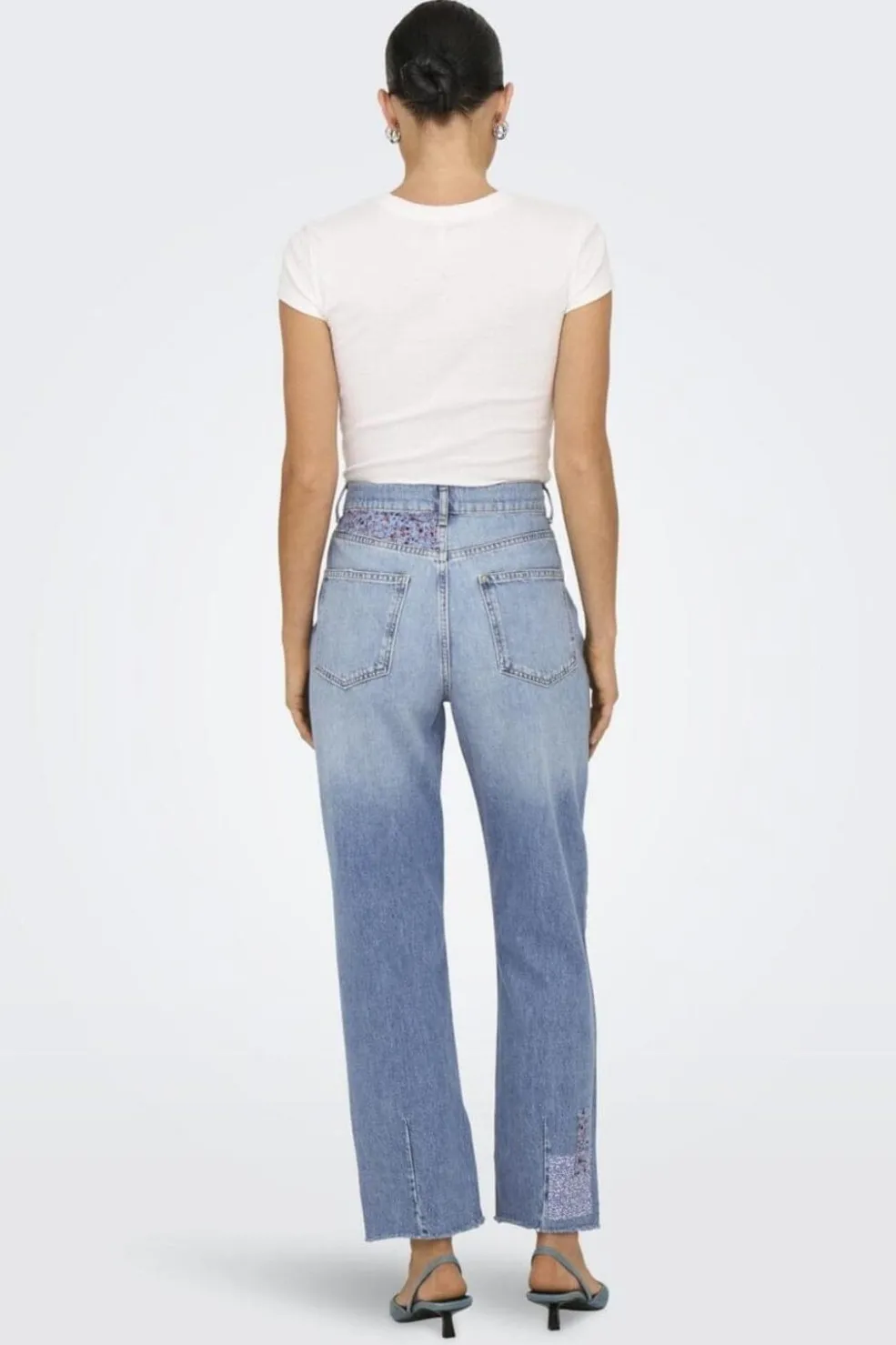 Straight jeans i medium blå denim med patchwork af forskellige blå stoffer og blomstermønstre. Bukserne har en loose fit og slidser i benene, der giver et unikt udtryk.