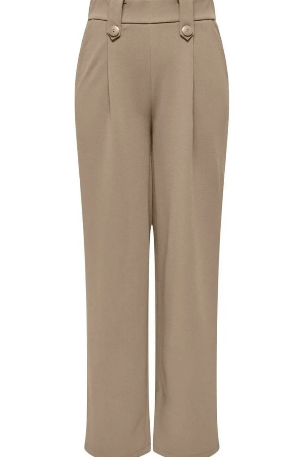 Lange bukser i humusfarvet stof med brede ben og plisseringer foran. Designet med knaplukning og bæltestropper ved taljen for nem justering af pasformen.