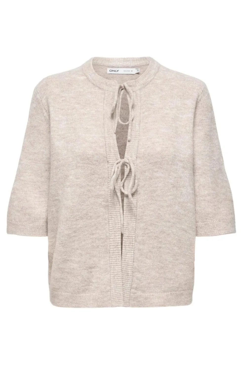Beige cardigan fra Only med løs pasform. Cardiganen har rund hals, 3/4-ærmer og bindebånd foran med sløjfedetaljer.