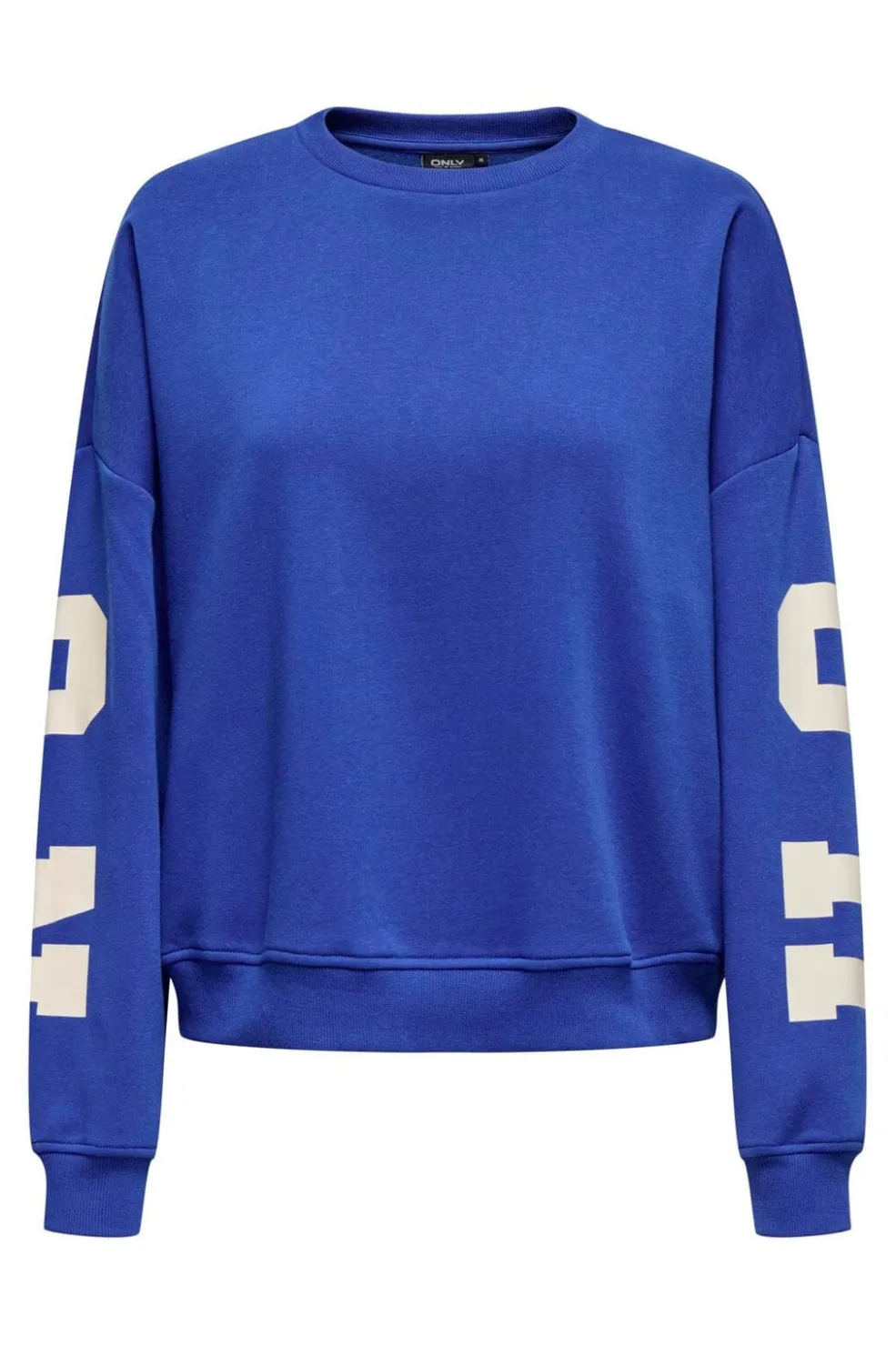 Blå sweatshirt fra Only med hvid tekst på ærmerne og ryggen. Sweatshirten har en rund hals og lange ærmer.