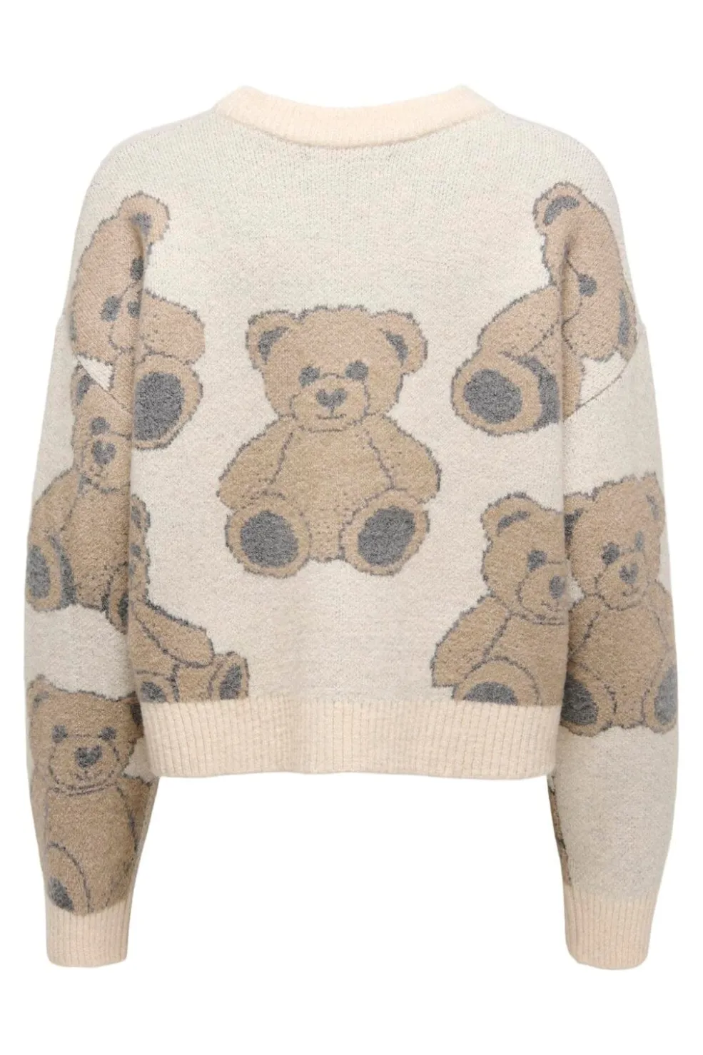 Striktrøje fra Only i en lys beige nuance. Den har et teddybjørnsmønster i brune og grå toner samt en rund halsudskæring med ribkant.
