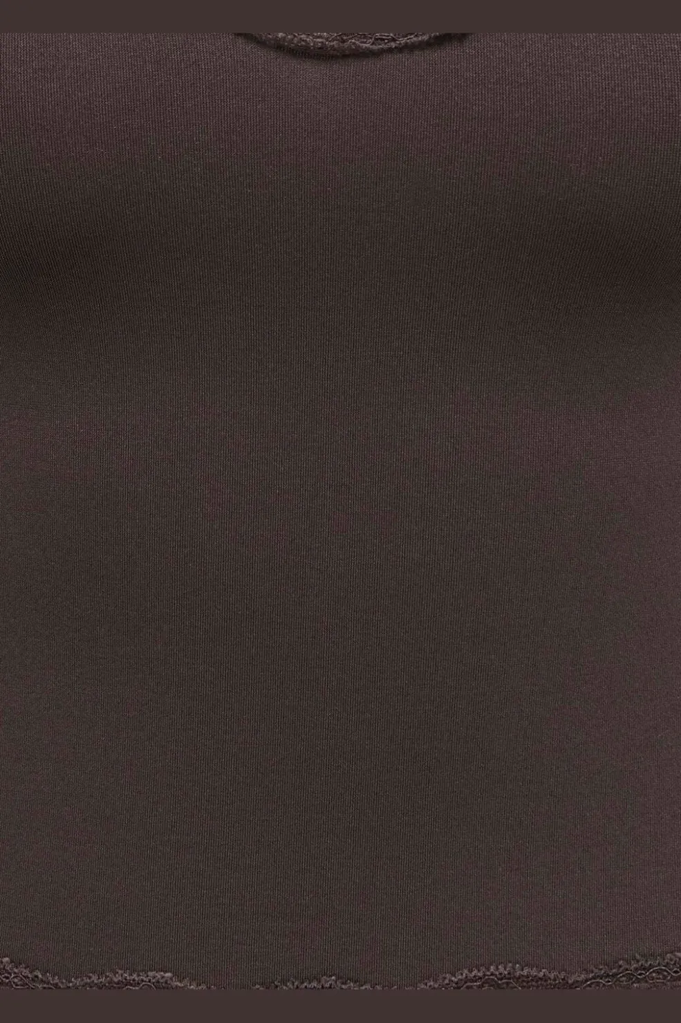 Brun cropped top fra Only med blondekanter. Toppen har en V-udskæring og er lavet i et blødt, strækbart materiale med fine blondedetaljer langs kanterne.