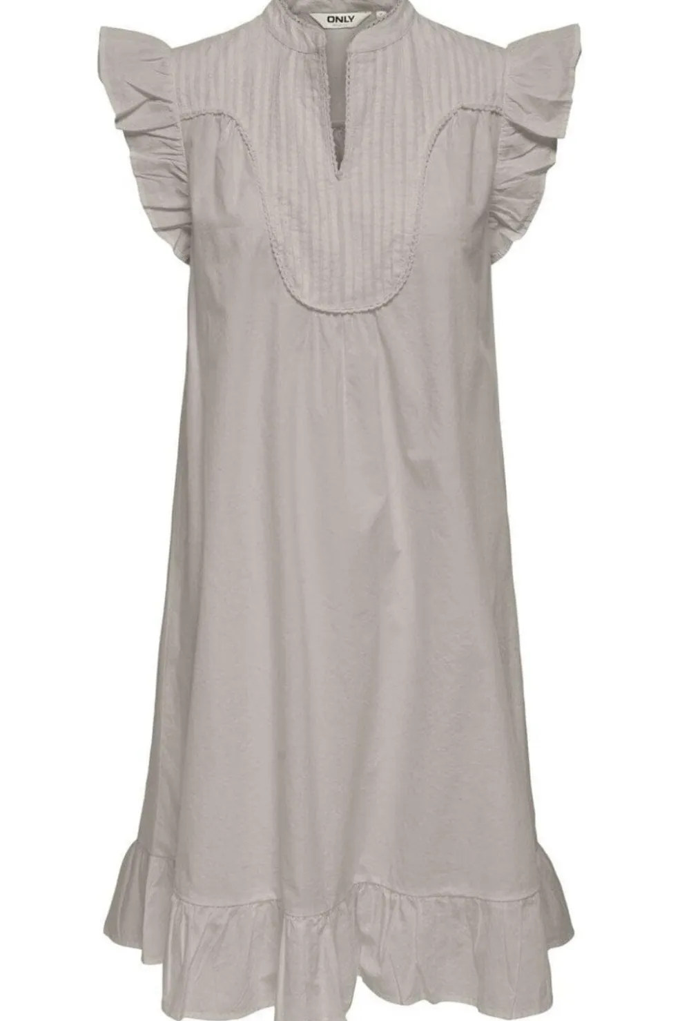 Ærmeløs kjole fra Only i lys grå. Kjolen har V-hals med plisseret front og flæser ved ærmegab og forneden. Designet kombinerer bløde detaljer med en enkel silhuet.