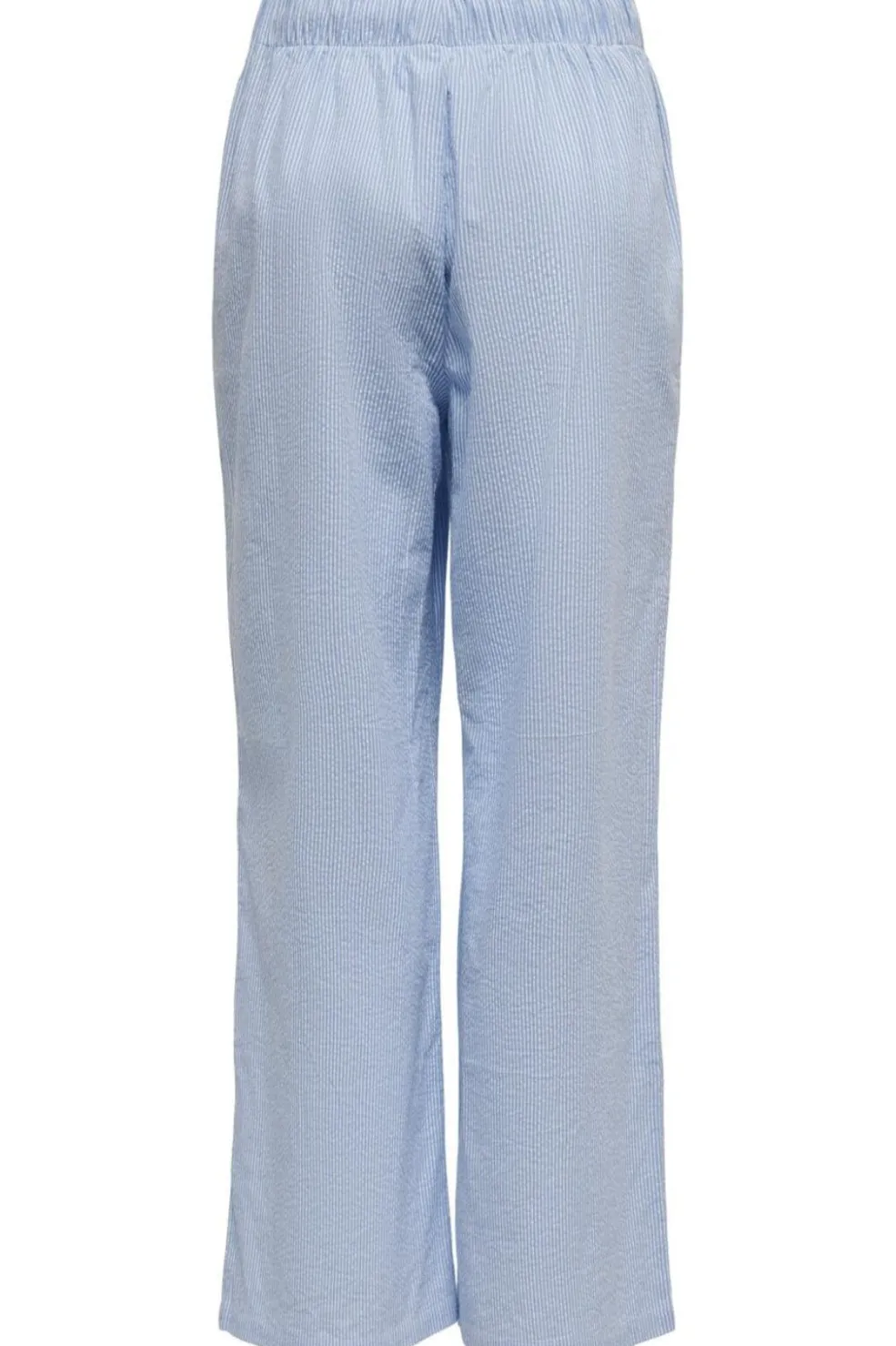 Stribede bukser fra Only med brede ben og bindebånd i taljen. Bukserne har et lyseblåt og hvidt stribeprint og en ankellængde, der passer til både sneakers og høje hæle.