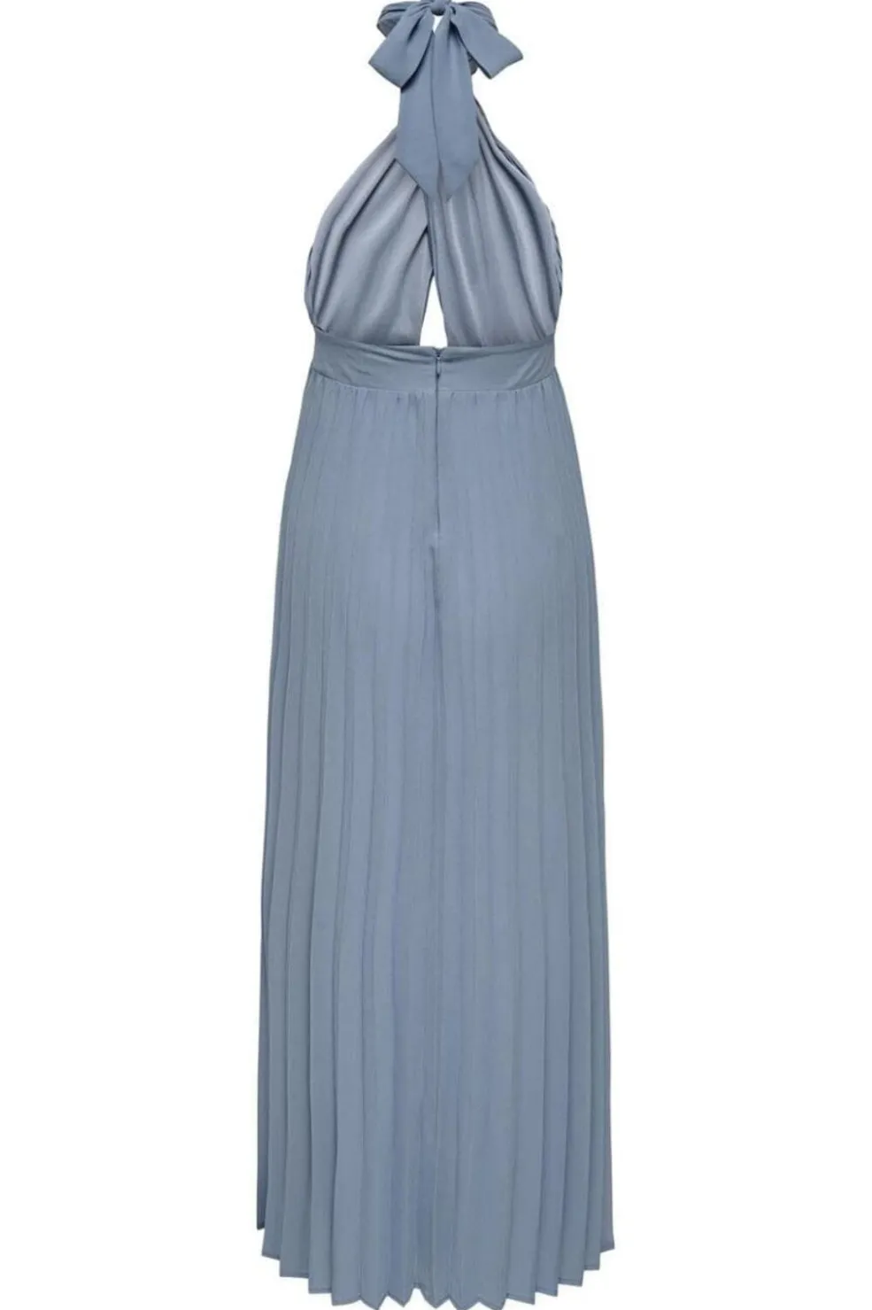 Lang kjole fra Only i lyseblå. Kjolen har et plisseret design med halterneck og sløjfe ved nakken. Den gulvlange silhuet og det ærmeløse design passer til festlige anledninger.