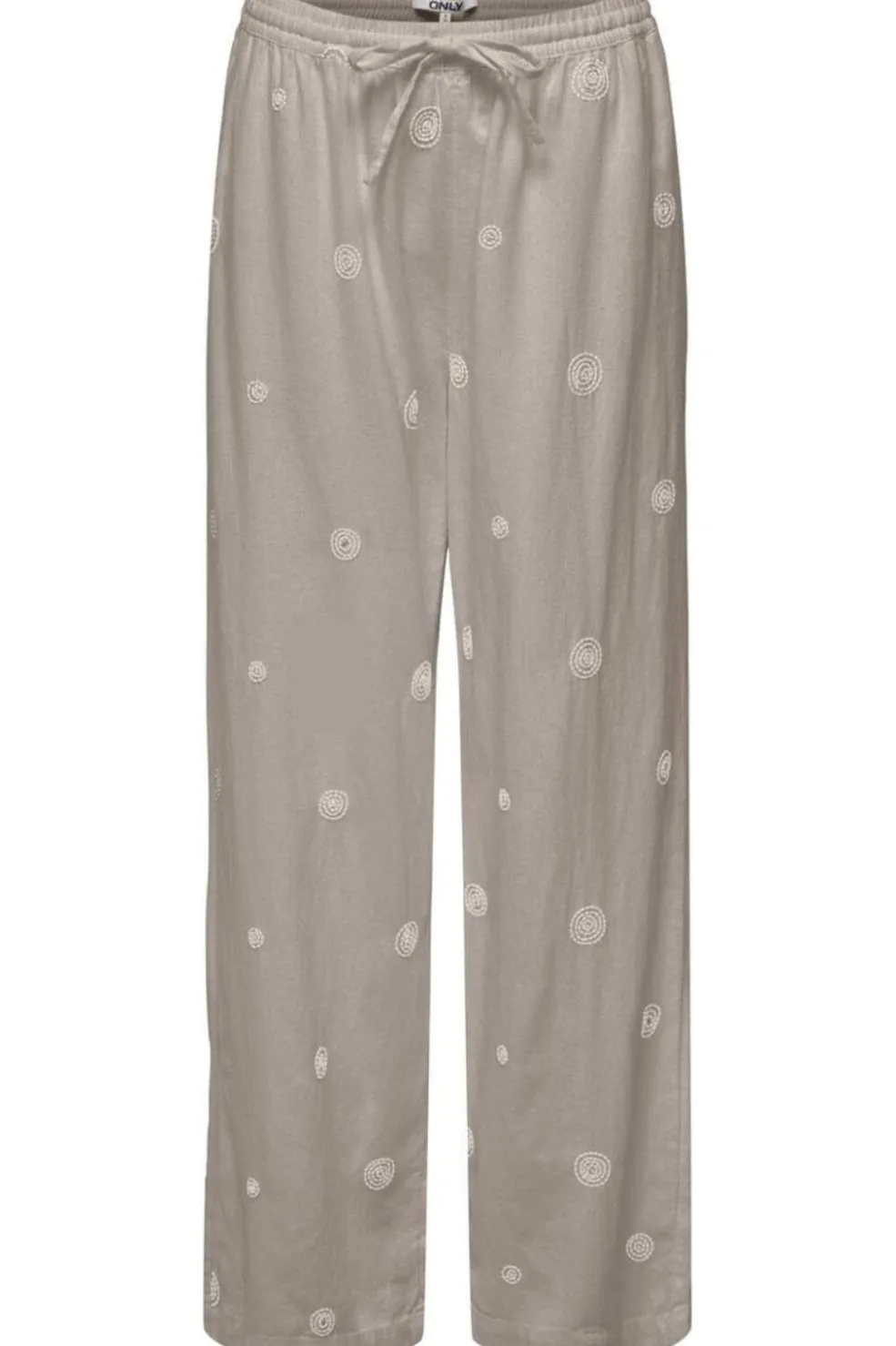 Beige bukser fra Only med brede ben og broderede cirkler. Bukserne har en løs pasform og bindebånd i taljen, som gør dem behagelige at have på både hjemme og ude.