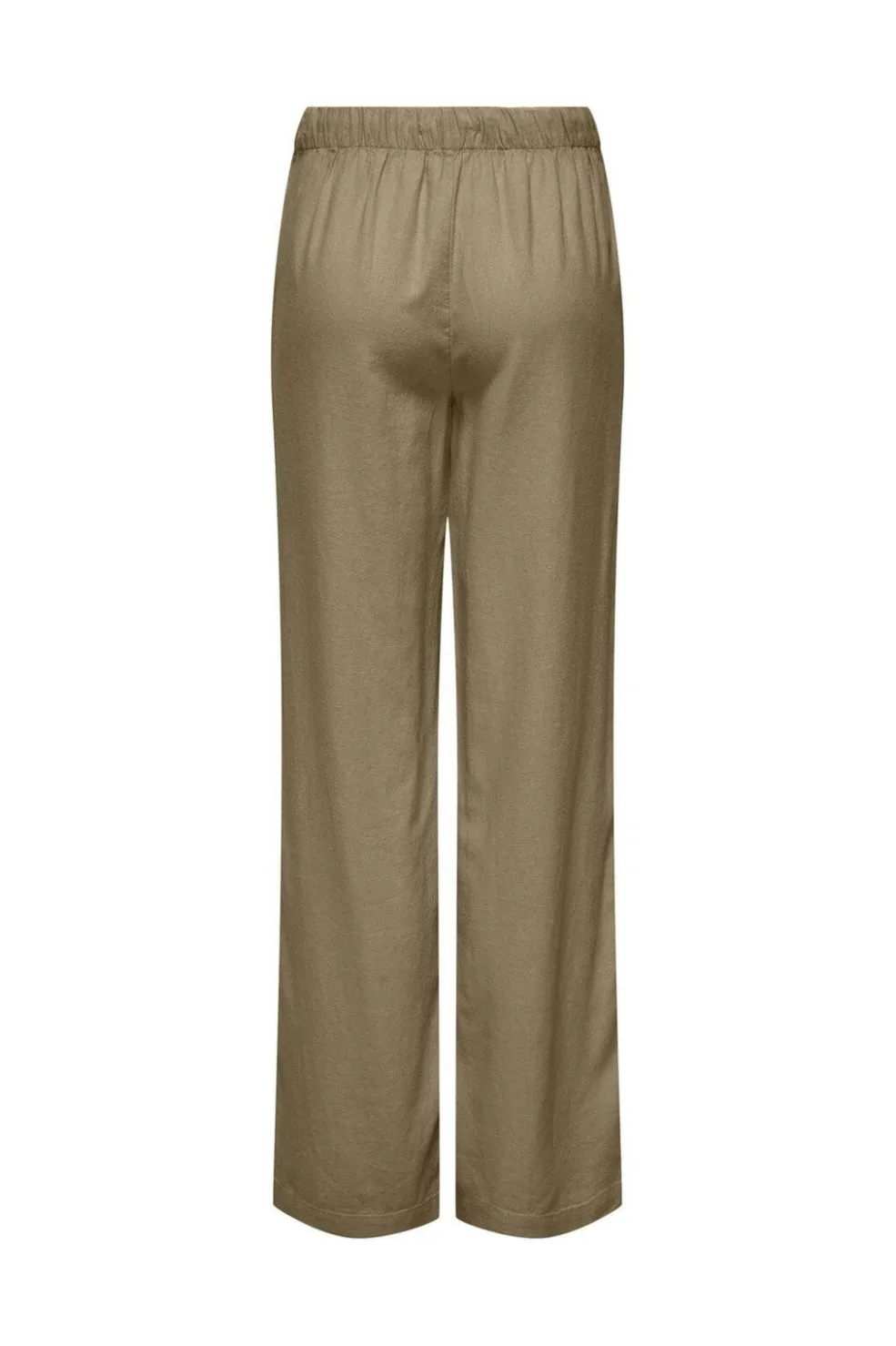 Løse bukser fra Only i en neutral elmwood-farve. Bukserne har en afslappet silhuet med brede ben og bindebånd i taljen. De lange ben giver gode stylingmuligheder året rundt.