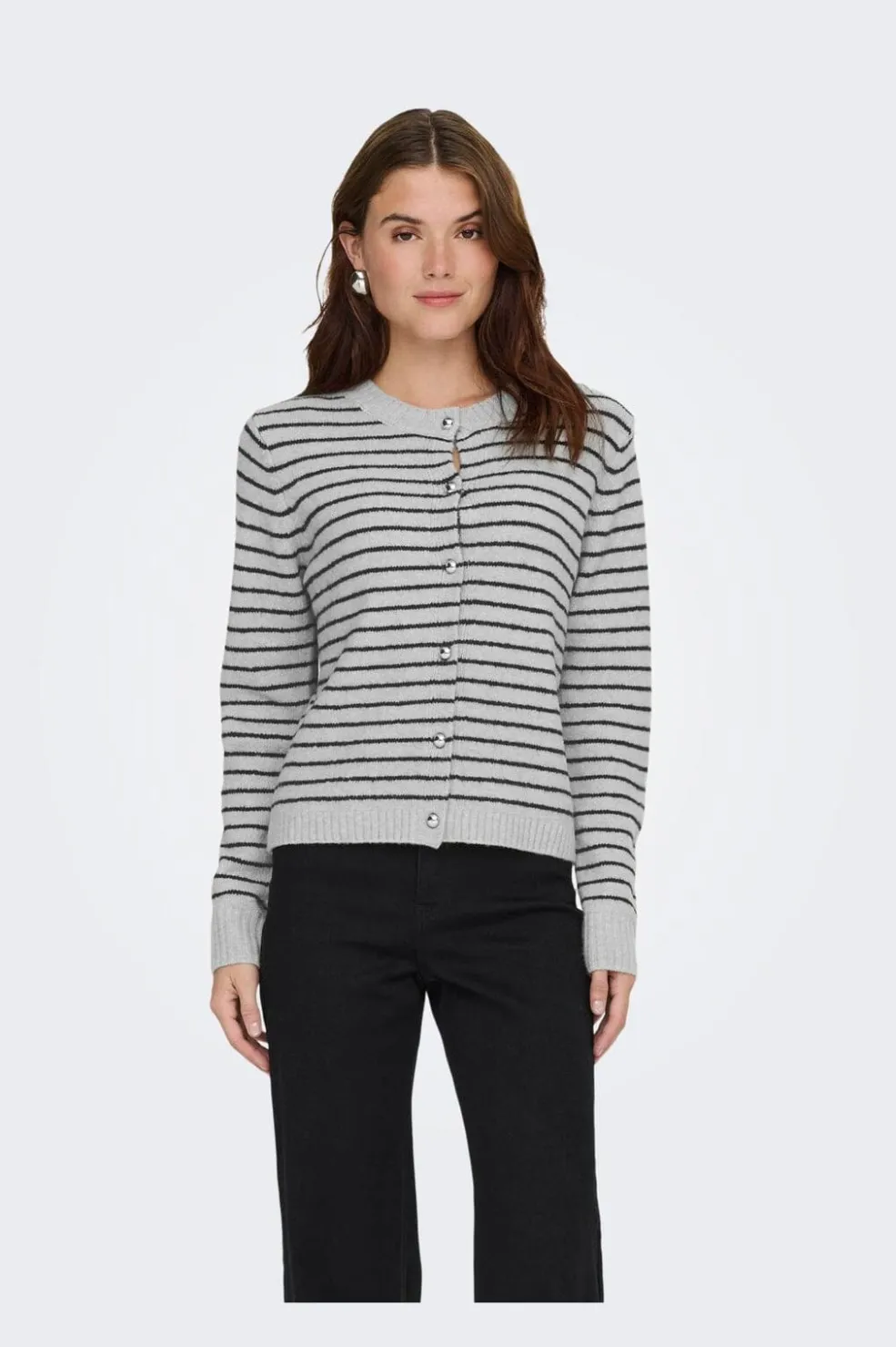 Stribet cardigan fra Only i lys grå med sorte horisontale striber. Cardiganen har sølvfarvede knapper og perledetaljer.