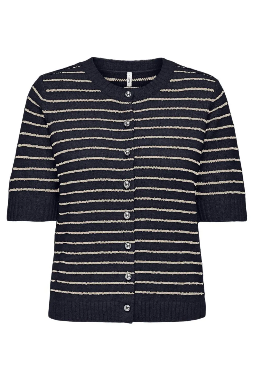 En stribet cardigan fra Only i mørkeblå og beige nuancer med sølvfarvede knapper. Cardiganen har korte ærmer og en regular fit-pasform.