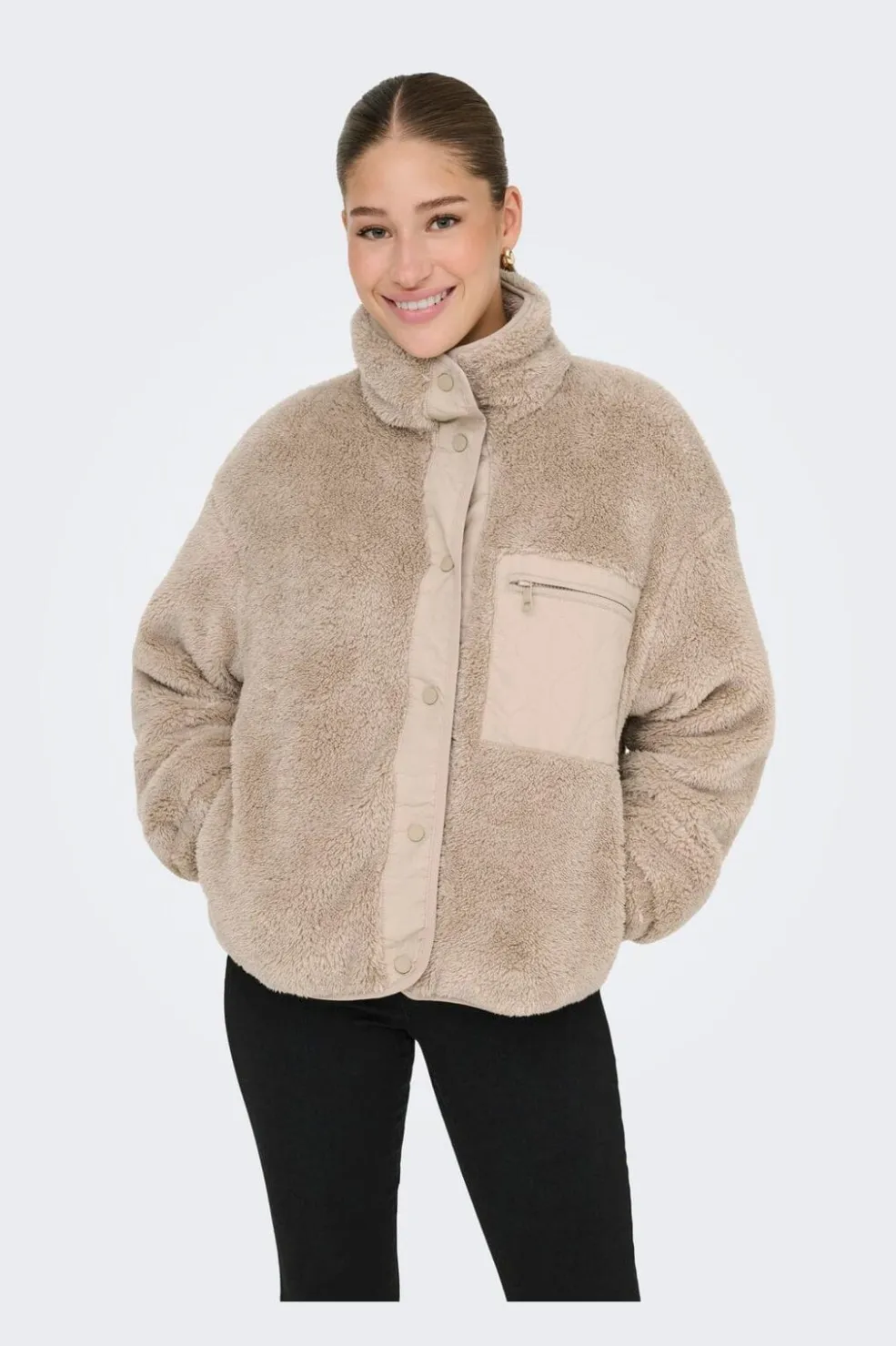 Beige jakke fra Only med fluffy tekstur og høj krave. Den har en oversized pasform og er lavet af genanvendt polyester med en blød overflade og praktiske detaljer.