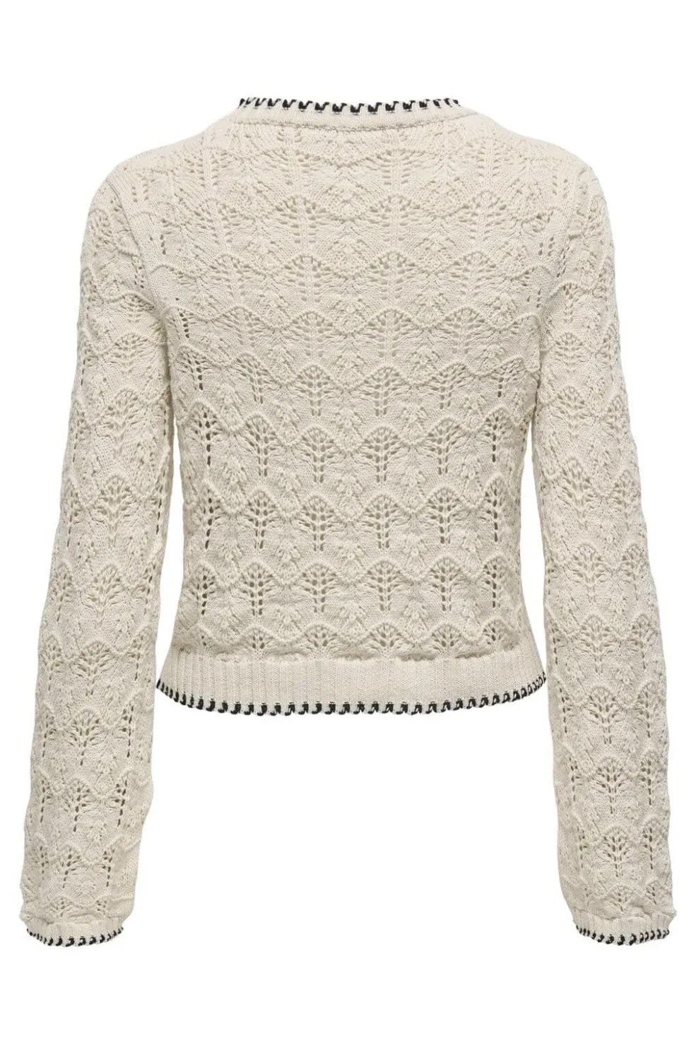 Strikket sweater fra Only i ecru med sort kontrast ved halsudskæringen og kanterne. Designet med hulmønster og lange ærmer. Den runde halsudskæring og strukturstrikken giver sweateren et karakteristisk udtryk.