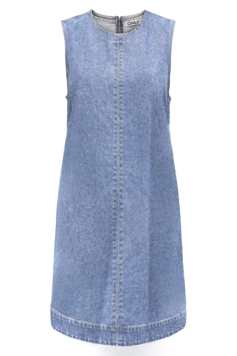 Lys blå denimkjole fra Only med rund halsudskæring. Kjolen har et ærmeløst design og en lige silhuet med lynlås bagpå. Den lyseblå denim giver et sommerligt udtryk.