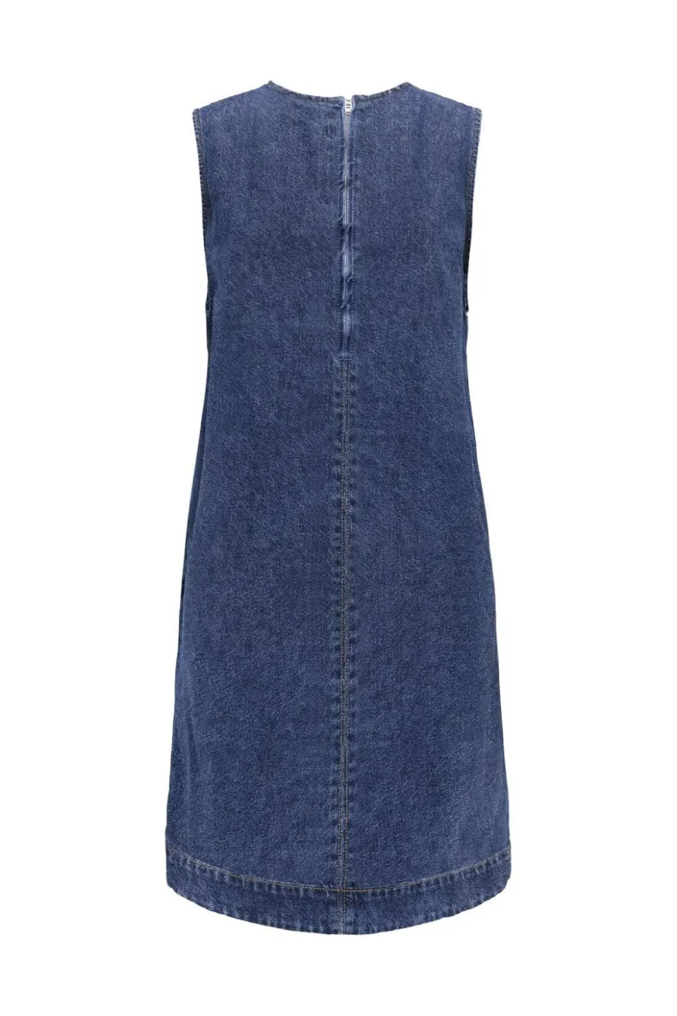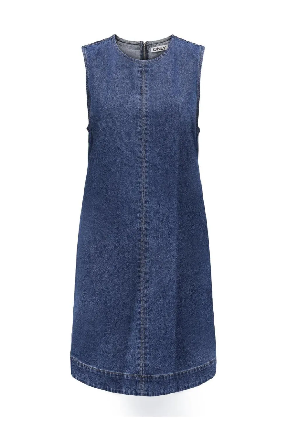 Ærmeløs denimkjole fra Only i mellemblå denim. Kjolen har en rund halsudskæring og lukkes med lynlås bagpå. Den enkle stil gør den nem at style både om sommeren og om vinteren.